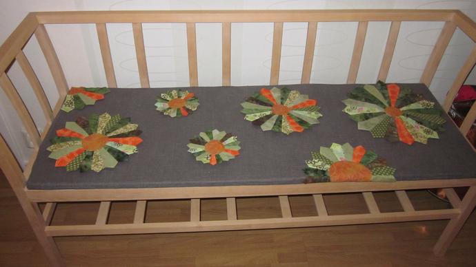 Men i min iver att hitta sömnadsprojekt har jag nu kommit fram till att det är dags att pigga upp dynan. Eftersom tapeten går i svagt grönt så letade jag på vad jag har av gröna tyger. Så tog jag till lite orange också för att få en färgklick. Jag har faktiskt inte tyckt om orange sedan 70-talet då vi hade någon hemsk medaljongtapet i orange och brunt. Men 30-40 års paus från en färg kan väl räcka, nu tycker jag helt plötsligt att orange är en väldigt glad och pigg färg.