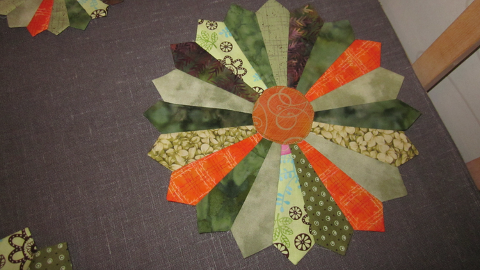 Jag köpte en Dresden Plate-linjal i höstas och nu var det dags att testa den. Under veckan som gått har jag stulit kortare och längre stunder nästan varje kväll och fått ihop sex "blommor".