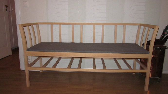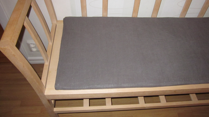 Ja, egentligen är den min. Men det är min dotter som gjort den. Hon gjorde den under sitt första år på Capellagården på Öland när hon utbildade sig till möbelsnickare. Från idé till färdig produkt. Jag älskar den soffan. När dynan syddes var det viktigt att den skulle vara neutral. Det var soffan som skulle synas, inte dynan.