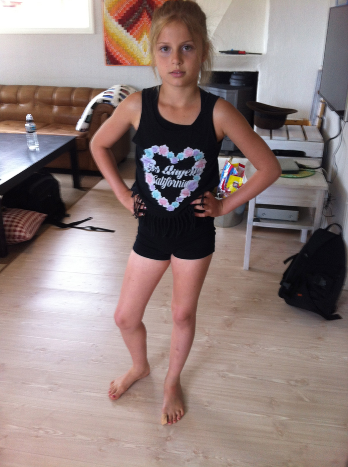 Det här är ett första försök/test för att se om jag klarar av att sy kläder till deras dansträning och sedan även tävlingskläder. De här byxorna syddes av pappas gamla urvuxna t-shirt. (Urvuxen är "rätt" håll, dvs han har bantat sig ur den!) Först blev jag lite orolig när jag såg alla mönsterdelar. Tre vardera till varje byxhalva och sedan tre mönsterdelar till midjeavskärningen. Det var Upper waist och Lower waist och Front waist. Men det gav sig vartefter och visade sig till slut att det inte alls var svårt. Det enda svåra var att tyget rullade sig så väldigt i kanterna. Så uppför sig väl bara stretchtyger och inte "ordentliga" quilttyger!? :) Nästa steg blir att testsy en topp, men till den måste jag ut och köpa tyg.