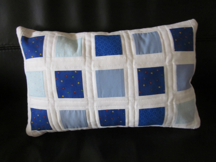 Jag hade en liten restbit liggande av dukvadd. Så jag tyckte det var passande att göra en duk av det. Storlek 43x28 cm. Och jag ville ha den blå. Vet inte riktigt varför, det var nog mest för att jag hade flera blåa tyger i scrapshögen. Sagt och gjort jag skar ut små fyrkanter, sydde ihop med vitt emellan och rakquiltade det hela.
