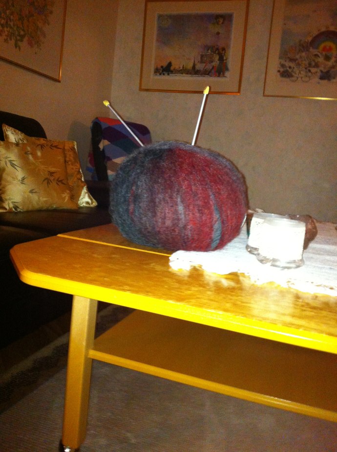 Jag skulle sticka en jättesjal till Tina. Garnet såldes bara i 350 grams nystan. Så när halsduken var klar syntes det klart att det skulle räcka till ännu en halsduk, denna gång till Leia. Och så blev det två mössor också och ett pannband. Sen var det mindre än en halvmeter kvar av nystanet.