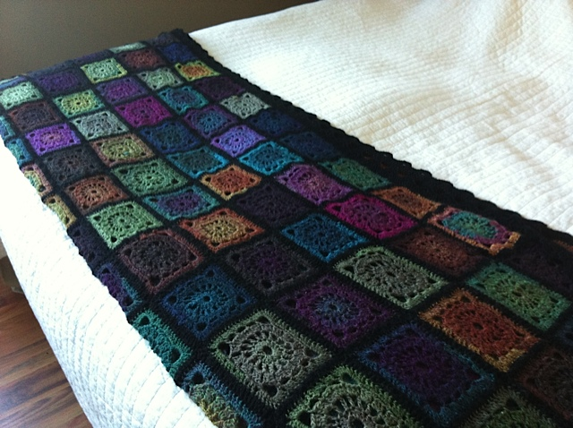Tina har också skickat foto på filten av mormorsrutor som jag virkade till henne för nåt år sedan. Den är ju riktigt fin ju. HÄrliga färger.