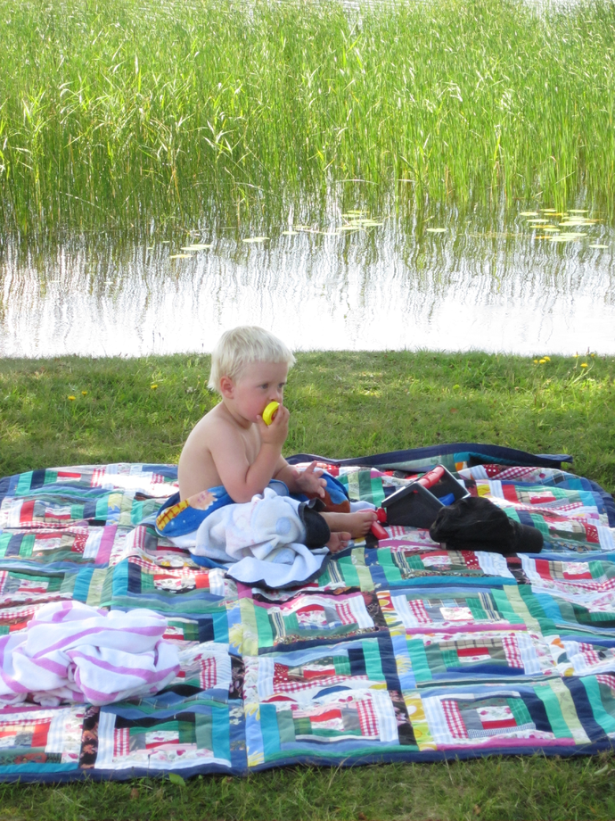 Ett skämmigt minne är den gången vi var så många uppe i stugan att det blev brist på sängkläder. Då fick dotterns man ta det här täcket över sig på natten, efter att det legat ute i gräset. Han som är mest allergisk av oss alla. Stackarn, han fick en hemsk natt och dag därpå. Förlåt Michael!