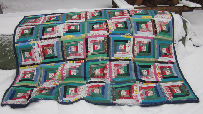 Men nu hade mamma kommit på att jag börjat sy lapptäcken så hon kom över med två stora kartonger med sina tygrester och det blev följande täcke.