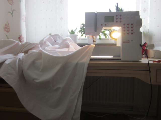 Vilken tur att jag gett min gamla maskin till sonen med familj, då var det bara att åka över och låna den. De är ju i alla fall bortresta på påsklov. Åh, så mjukt och ljuvligt och tyst den arbetar sig genom tyget. Undrar om Husqvarnan med all service i världen kan åstadkomma detsamma?