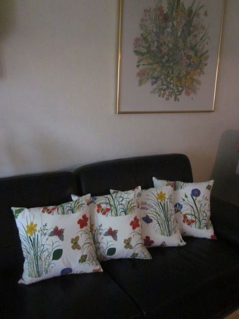 Jag sydde mig fyra nya kuddöverdrag till vardagsrummet. Kom över en bit av Josef Franks "Fjärilar blommor gräs". Så nu har jag sommar här hemma.