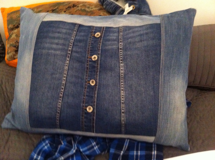 Det är vad sonhustrun sparat på sig. Tina berättade att hon först tänkt sig ett lapptäcke i jeanstyger. men sedan började det luta åt ett väggskydd ovanför sonens säng. Därefter kom beslutet att ett kuddfodral skulle sys till hans "megakudde".