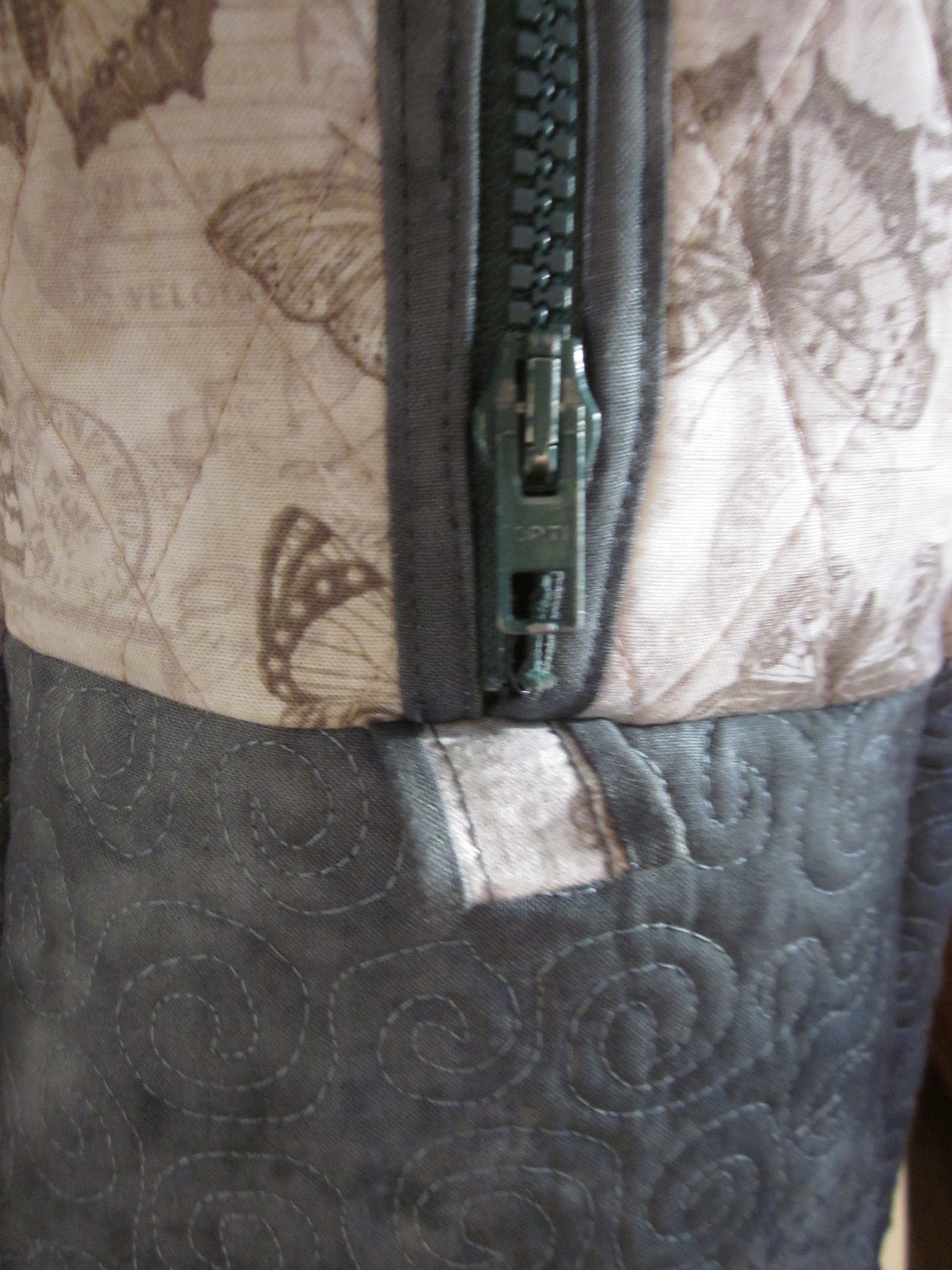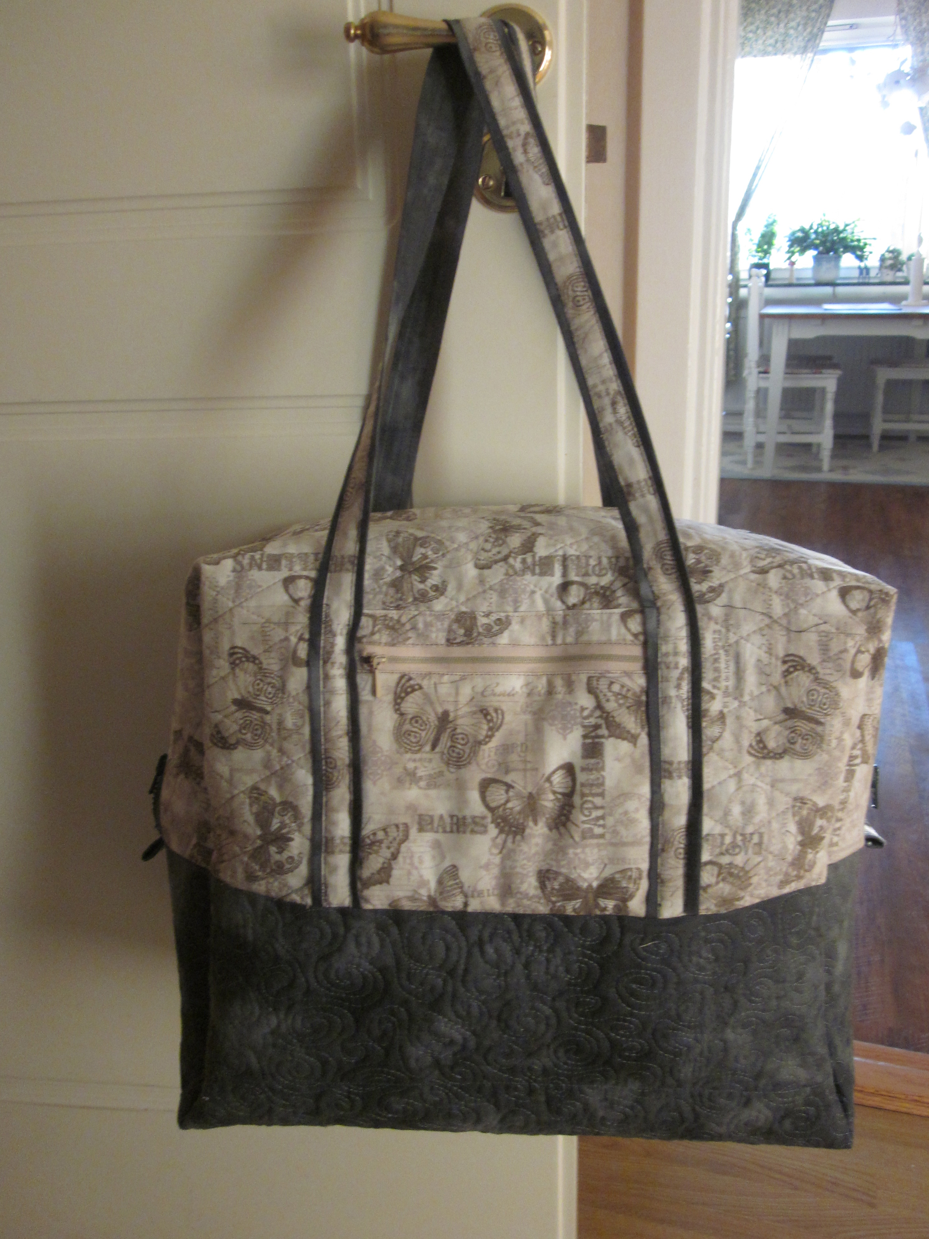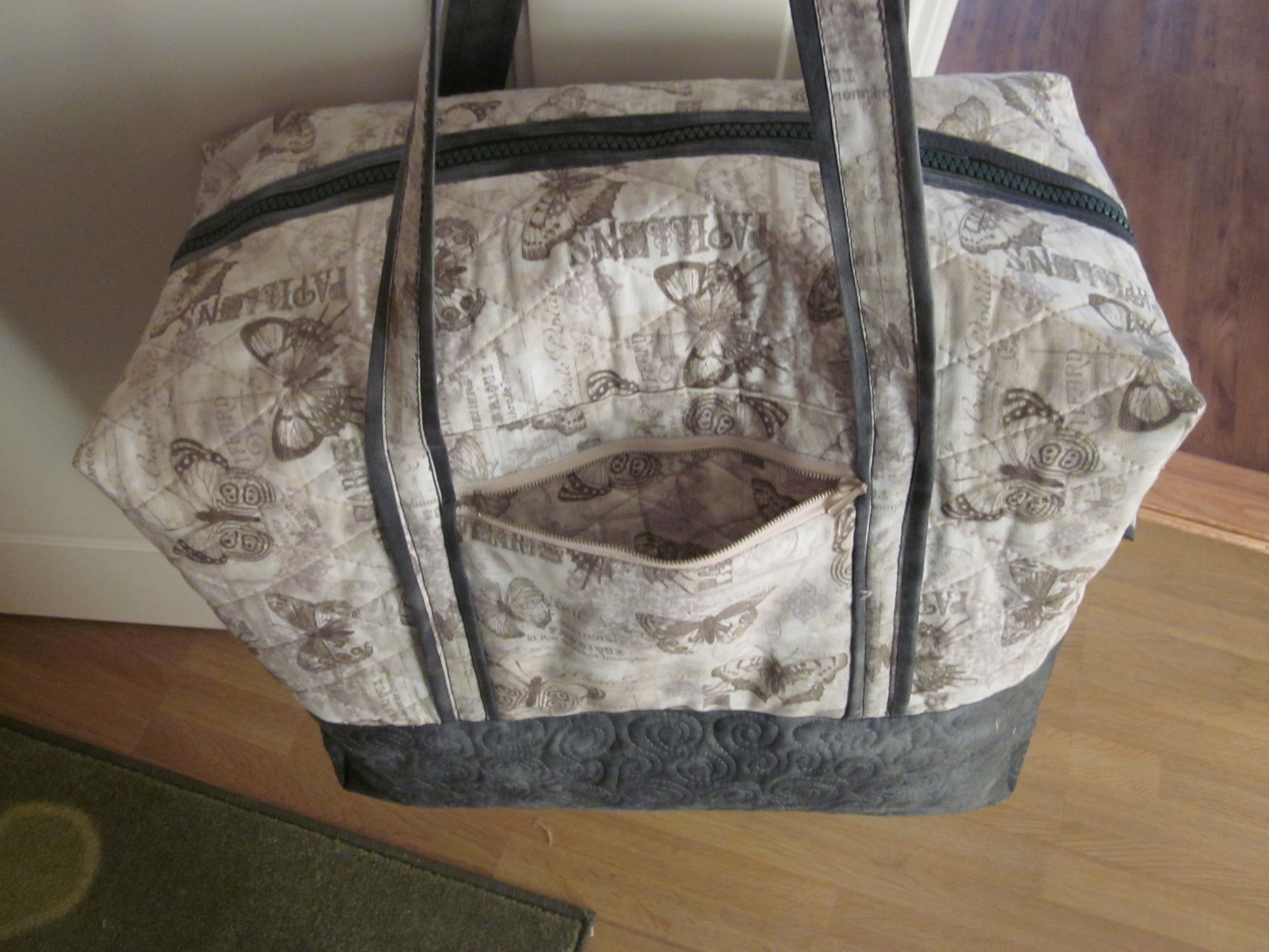 Jag köpte ett mönster till Weekendbag. Och naturligtvis tyg till det också. Nu har jag knåpat ihop det hela. Det var faktiskt mycket enkelt för mönstret var väldigt bra skrivet. Jag älskar fjärilstyget, men kanske är underdelen något lite för mörk. Men jag tycker det är jättefina handtag och flärpar. Och så hittade jag ett tvåvägsblixtlås i rätt färg och längd i min stora blixtlåssamling, det tror jag blir bra. Nu går det att öppna väskan från vilket håll man vill.