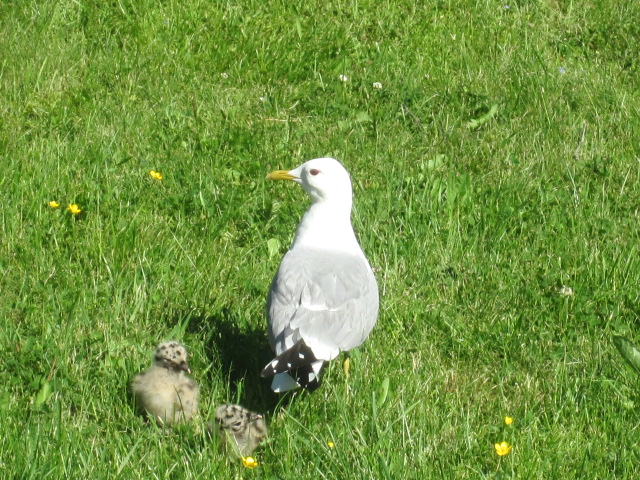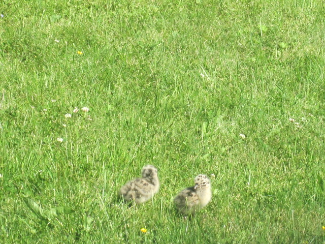 Jag försökte mota ut dem på berghällen, där de höll till i fjol. Men föräldrarna var väldigt vaksamma och aggressiva. Efter några timmars väntan tog jag mod till mig och bar själv ut dem. OJ vad föräldrarna skränade. Men jag var ju tvungen att få bort dem från gräsmattan för att kunna klippa den.