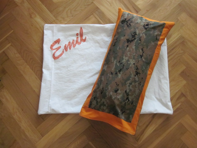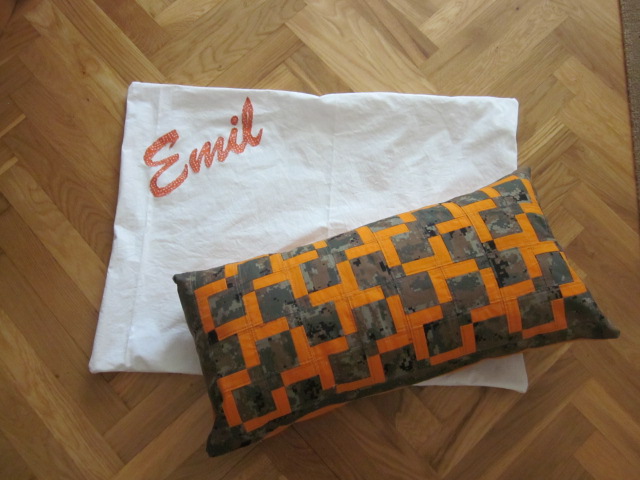 Nu löste det sig naturligtvis ändå. Jag sydde en innerkudde till det för lilla örngottet. På så vis fick han en mys-/prydnadskudde. Sen sydde jag snabbt ett stort örngott till hans megakudde. Det blev bara vit lakansväv men jag dekorerade med hans namn. Och dragkedja på baksidan. Hoppas han tycker om det.