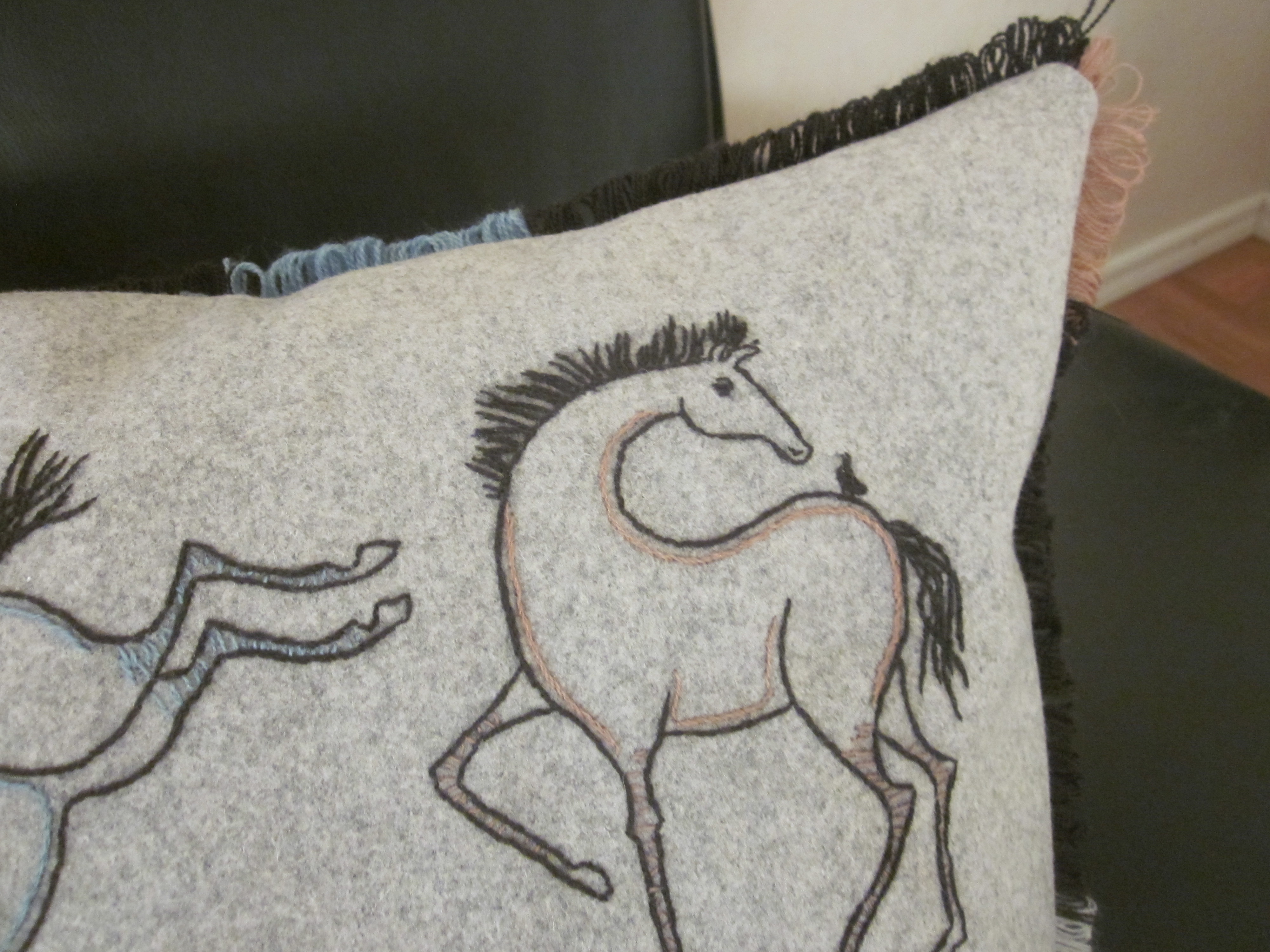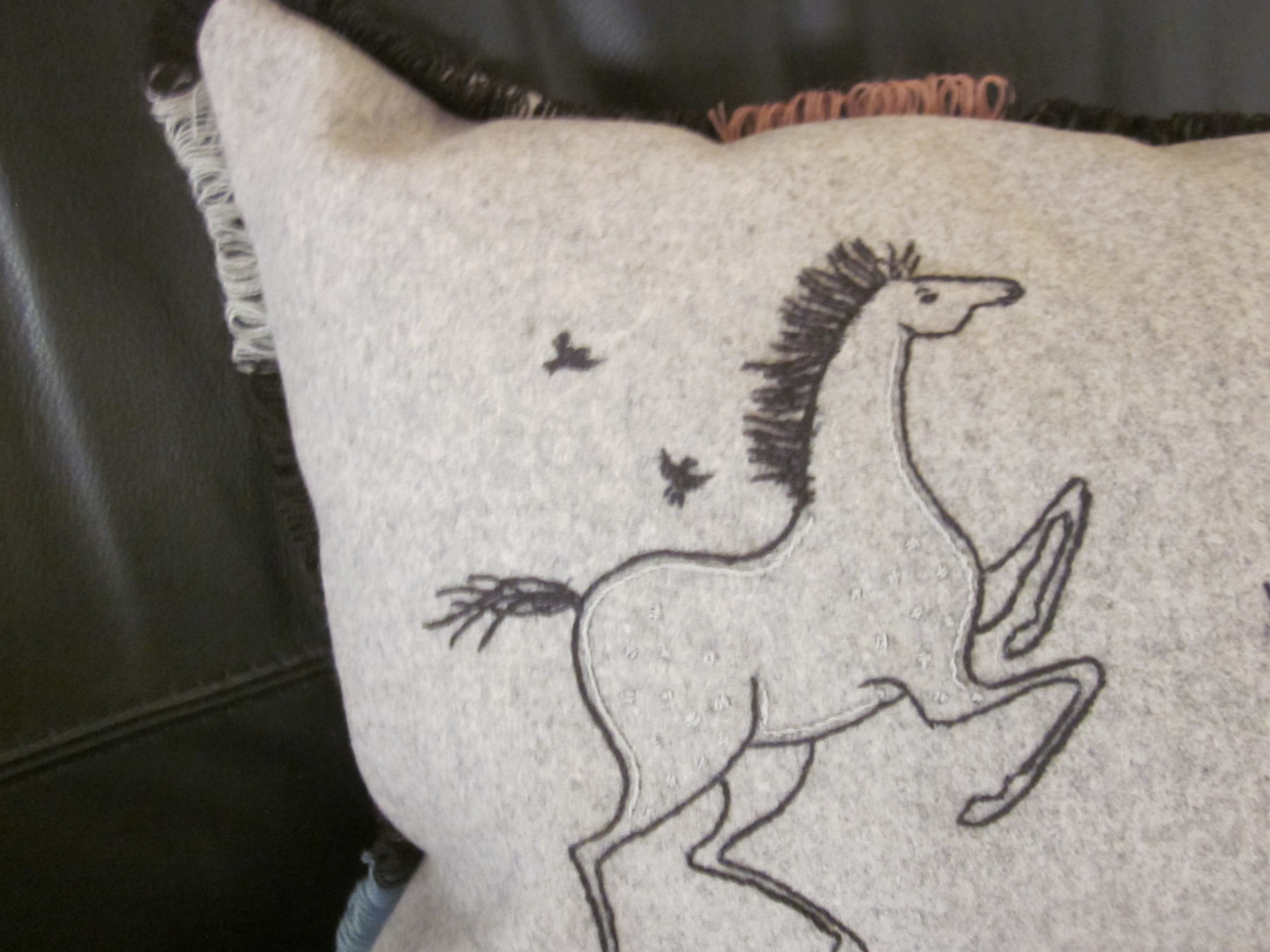 Den blev en present till syrran, för att det var så mycket hon. Ganska tjockt ylletyg som var lite besvärligt att sy i, speciellt de pyttesmå fåglarna. Man kunde inte alltid ta nålen både ner och upp i ett drag utan fick först sticka ner nålen till baksidan och dra igenom tråden, sedan upp igen.