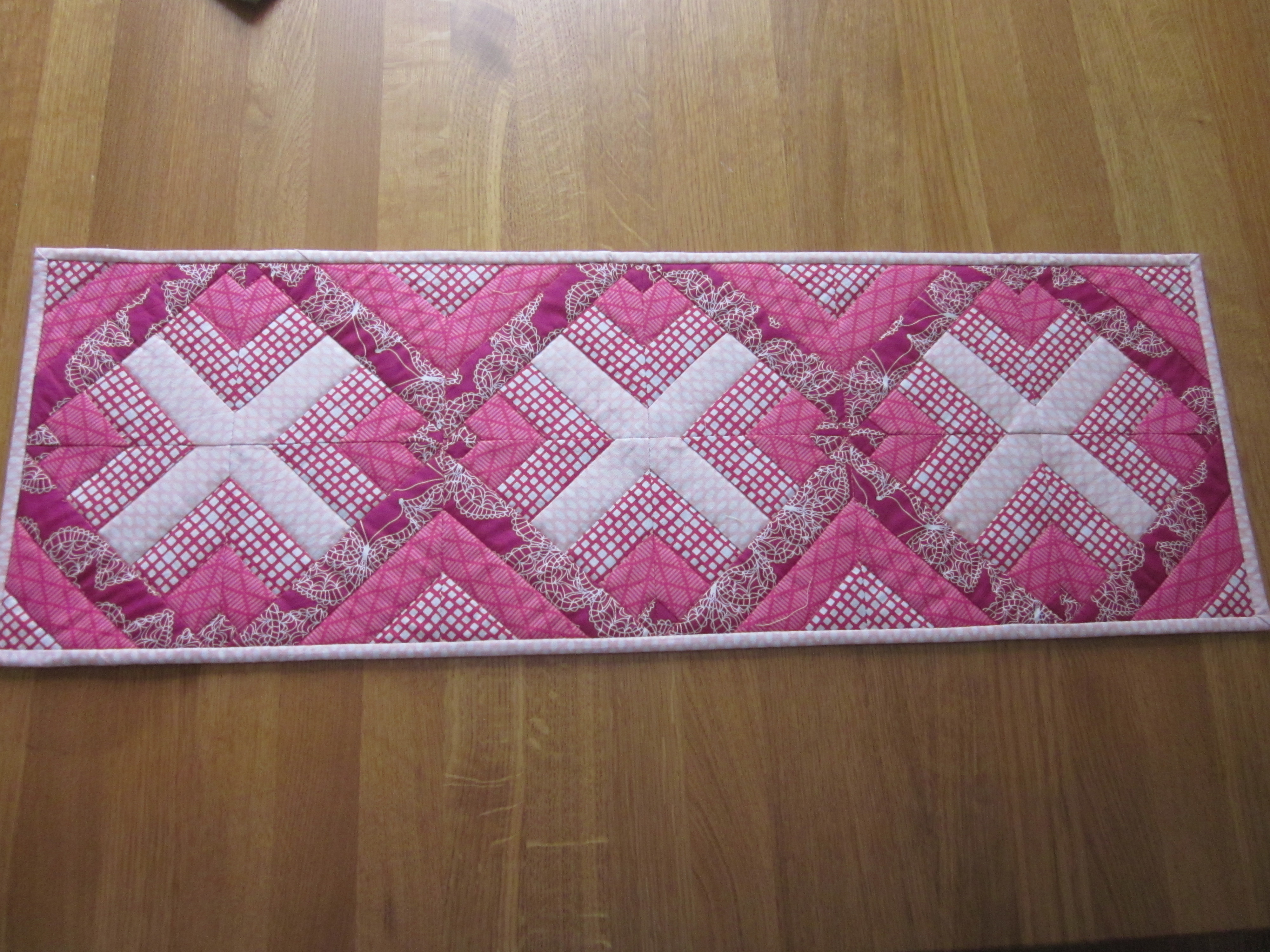 Det här mönstret såg jag i vintras på Bambis sida. Tyckte det var läckert och sydde en löpare i blått. www.helenaåhman.se... Tyvärr blev jag inte alls nöjd med färgen där, den blev alldeles för kall.