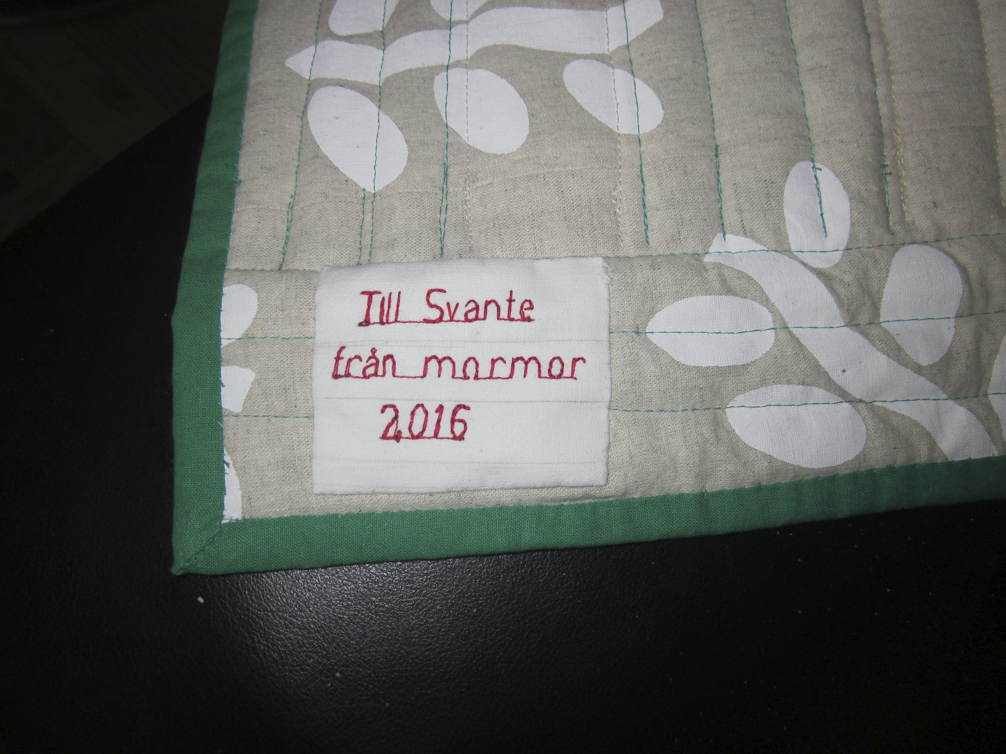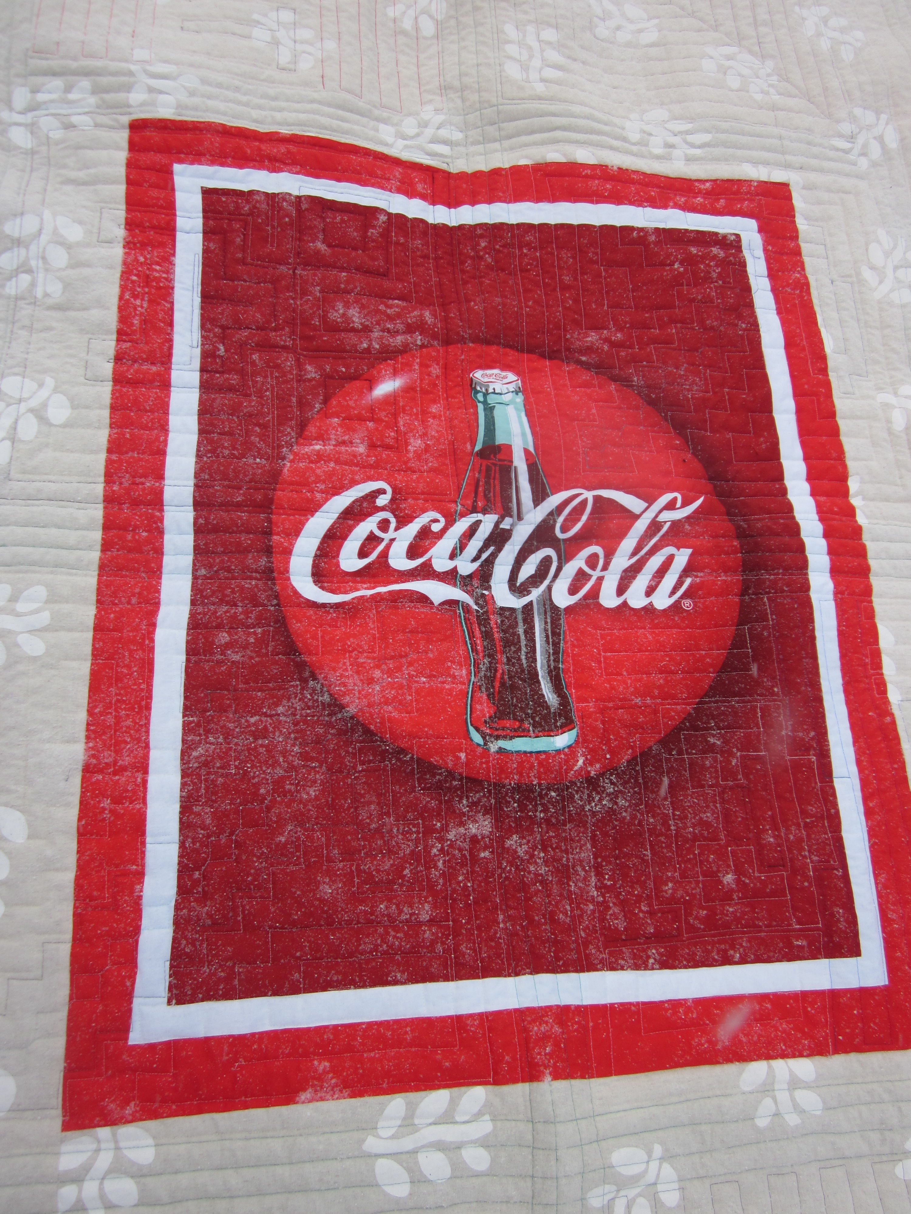 Jag gjorde ett impulsköp av ett tyg med Coca Cola-reklam för en tid sedan. När jag väl kom hem med det undrade jag varför jag köpt det, vad jag skulle ha det till. Nu fick det bli baksida på Svantes överkast, jag har fyllt ut med en gammal gardin. Har till och med kostat på mig en liten signering i ett hörn.