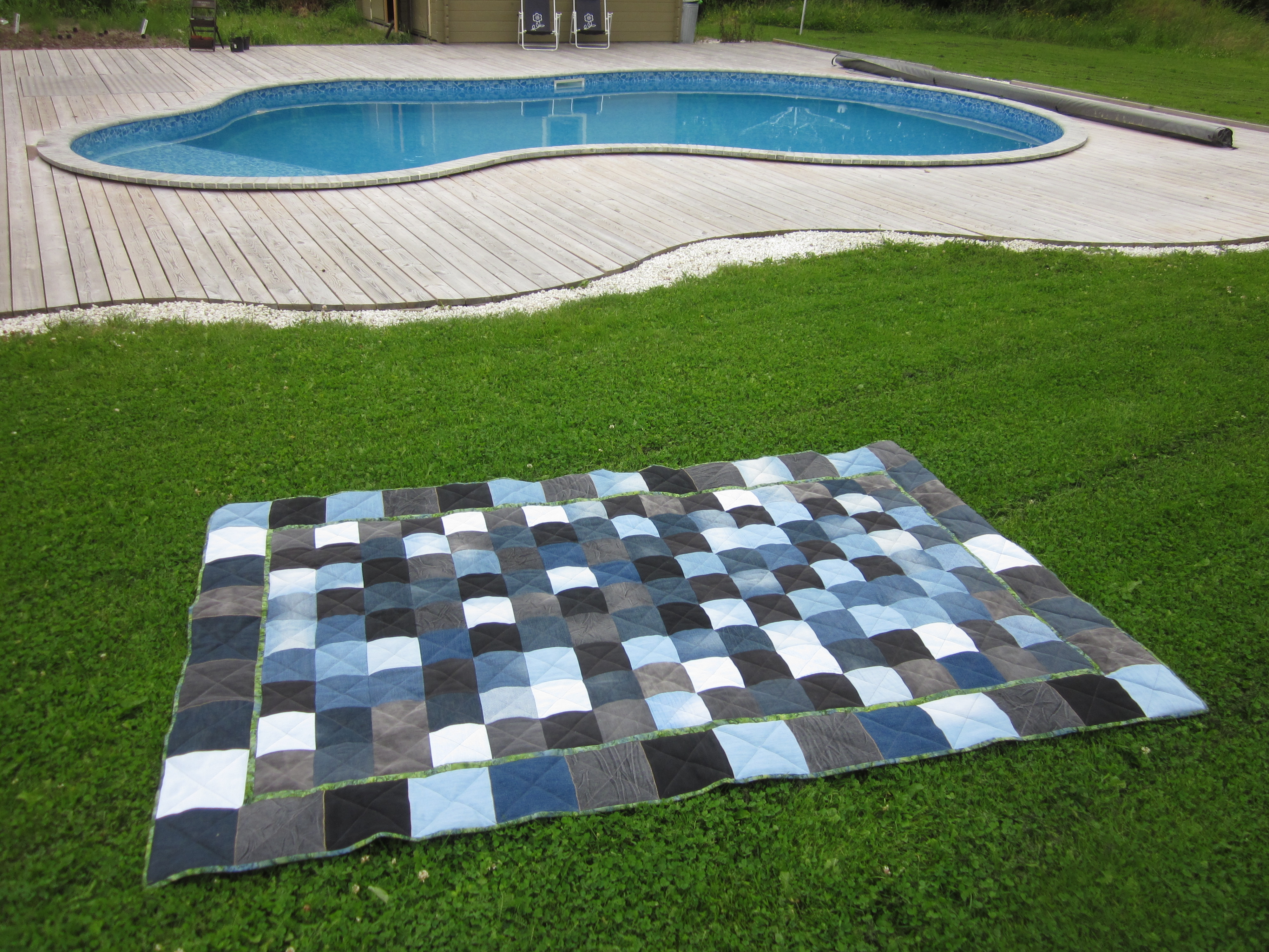 Jag började med att skära 6"-rutor. Men så visade det sig att man inte fick ut några 6"-rutor i barnjeansen, bara från vuxenjeansen. Så jag övergick till 5"-rutor. Därav "bården" med större rutor i yttervarvet. Jag hade lite tur för det skilde bara 0,5" för att få det att stämma mot varann i kort och långsidorna. Det har jag justerat med den smala gröna bården innanför de större rutorna.