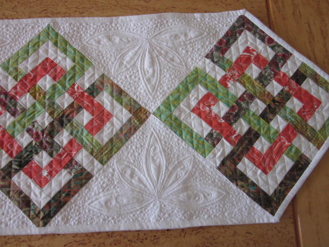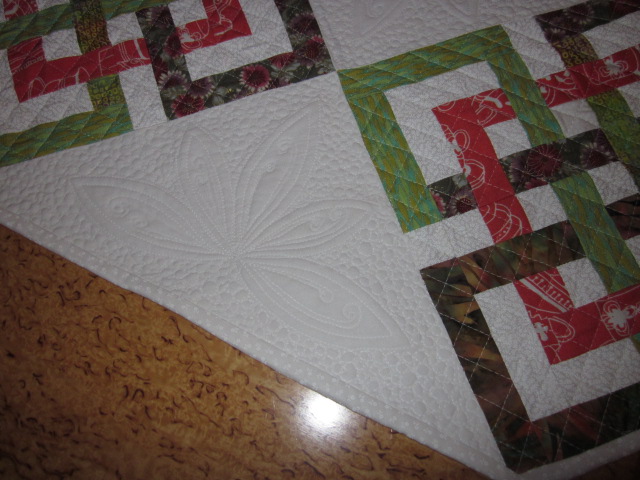 Den här duken har jag hållit på med länge. När jag började quilta den var min symaskin på värsta tänkbara humör. Jag fick superfula stygn. Endera drogs undertråden upp så det blev tygliga öglor på ovansidan. Eller så drogs övertråden ner och bildade ett enormt ormbo. Mycket sprätta och många svordomar blev det. Maskinen är i alla fall variationsrik med sina fel!