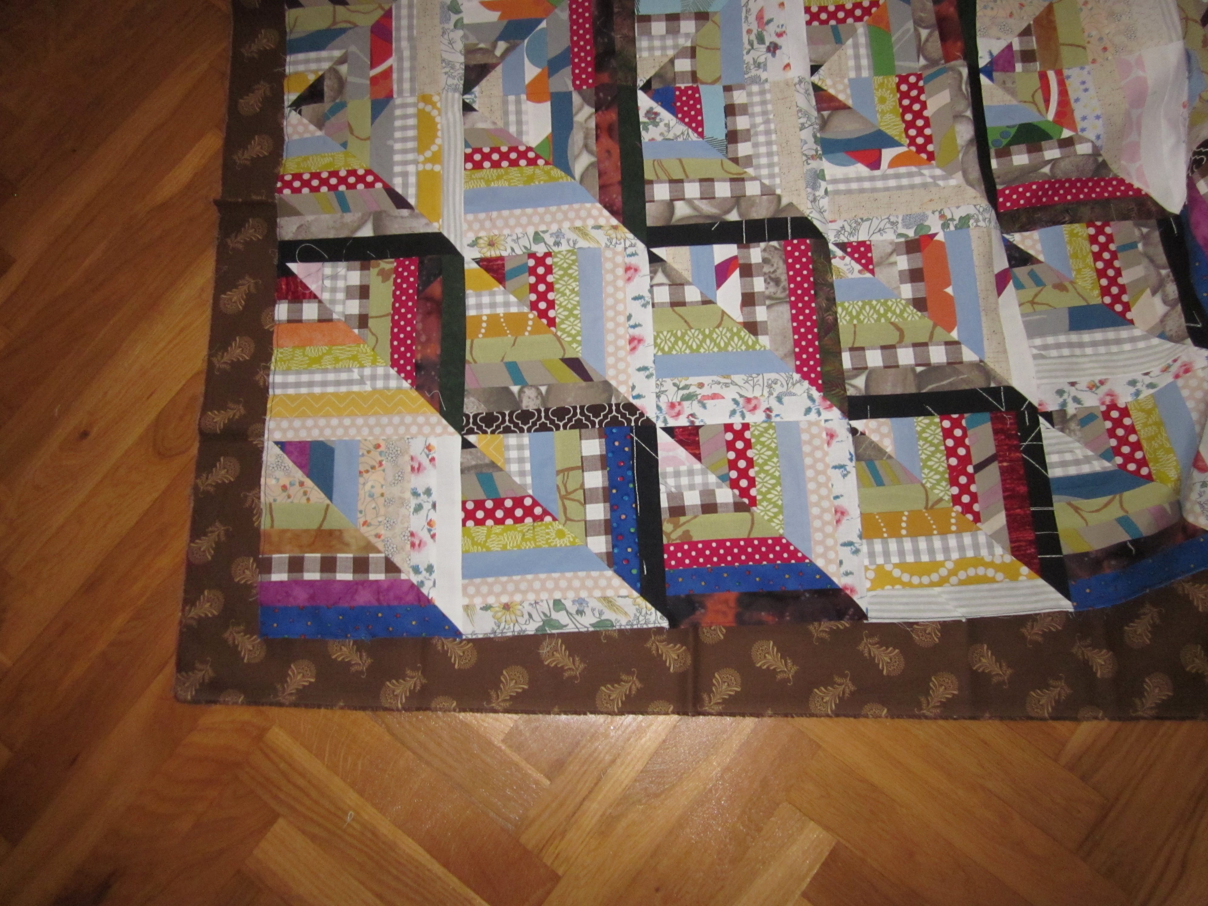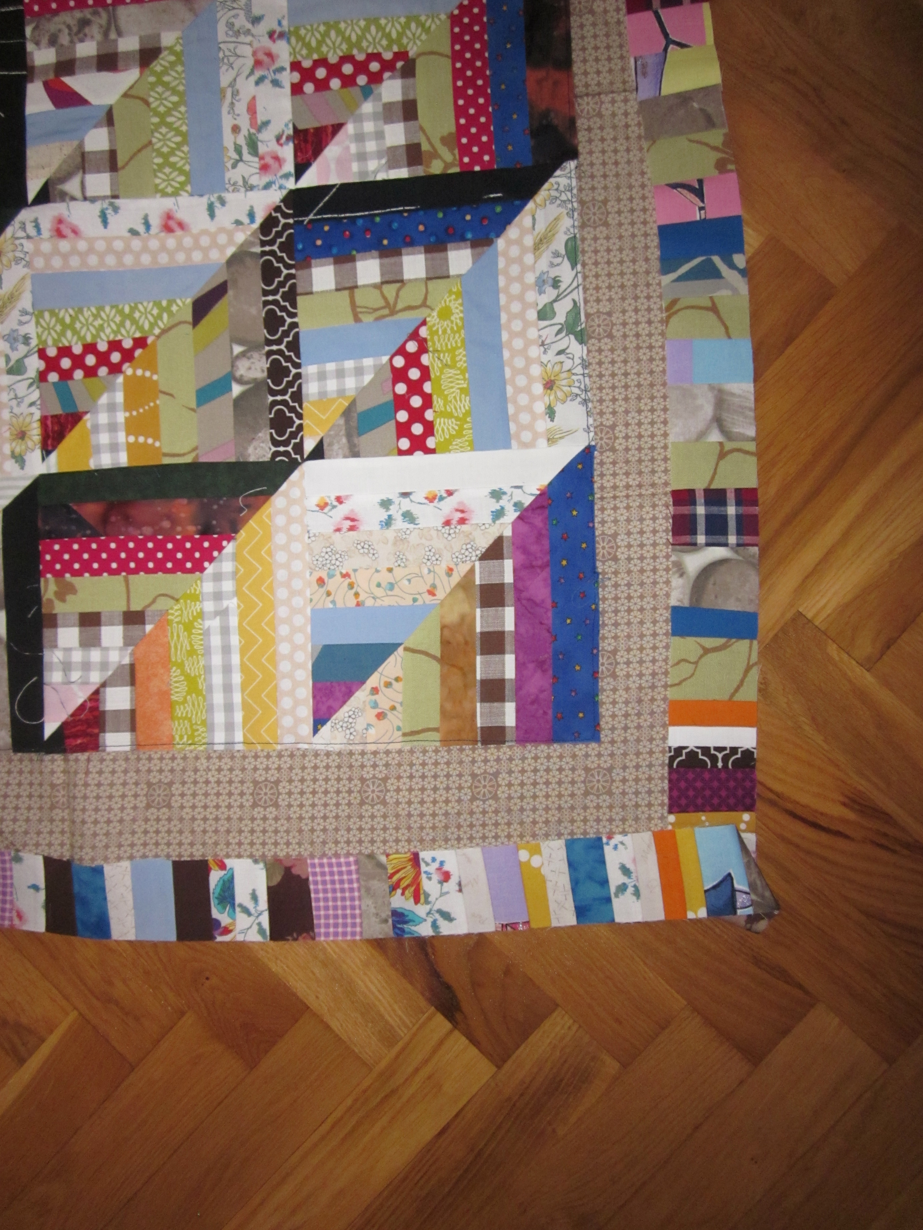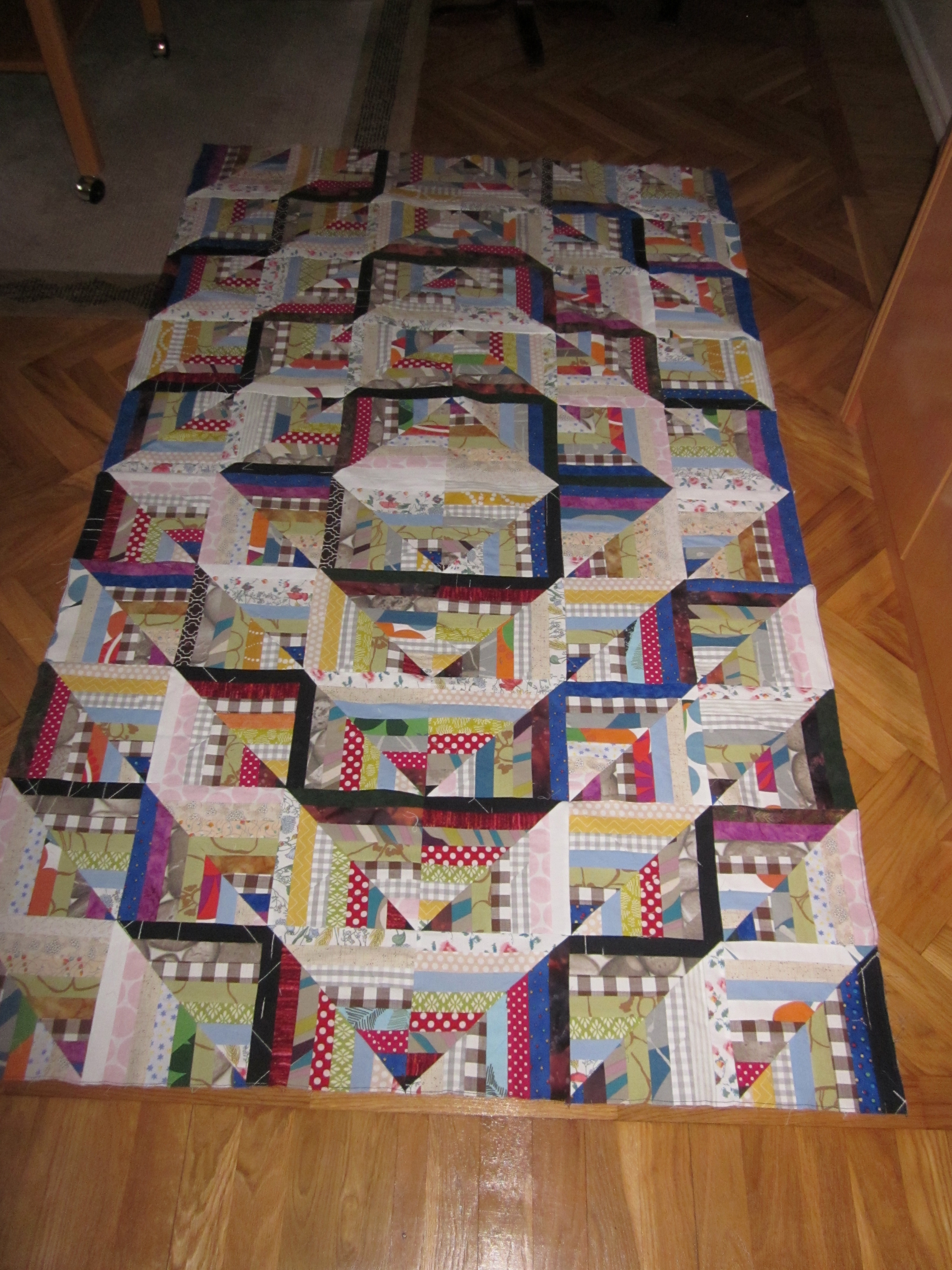 Det är den falska Log Cabin som jag sett hos janegardner.blogspot.se... som jag nu gett mig i kast med. Många remsor är det. Jag har framförallt förbrukat mina "fultyger" och det har faktiskt minskat en hel del. Ett par tre till sådana här quiltar så kanske det tar slut…Det är massor med skarvar i remsorna men det tycker jag inte gör något. Och det blir ju mindre spill då. (Sån man är. Jag längtar till att fultygerna ska ta slut, men jag får absolut inte slösa med dem!!)