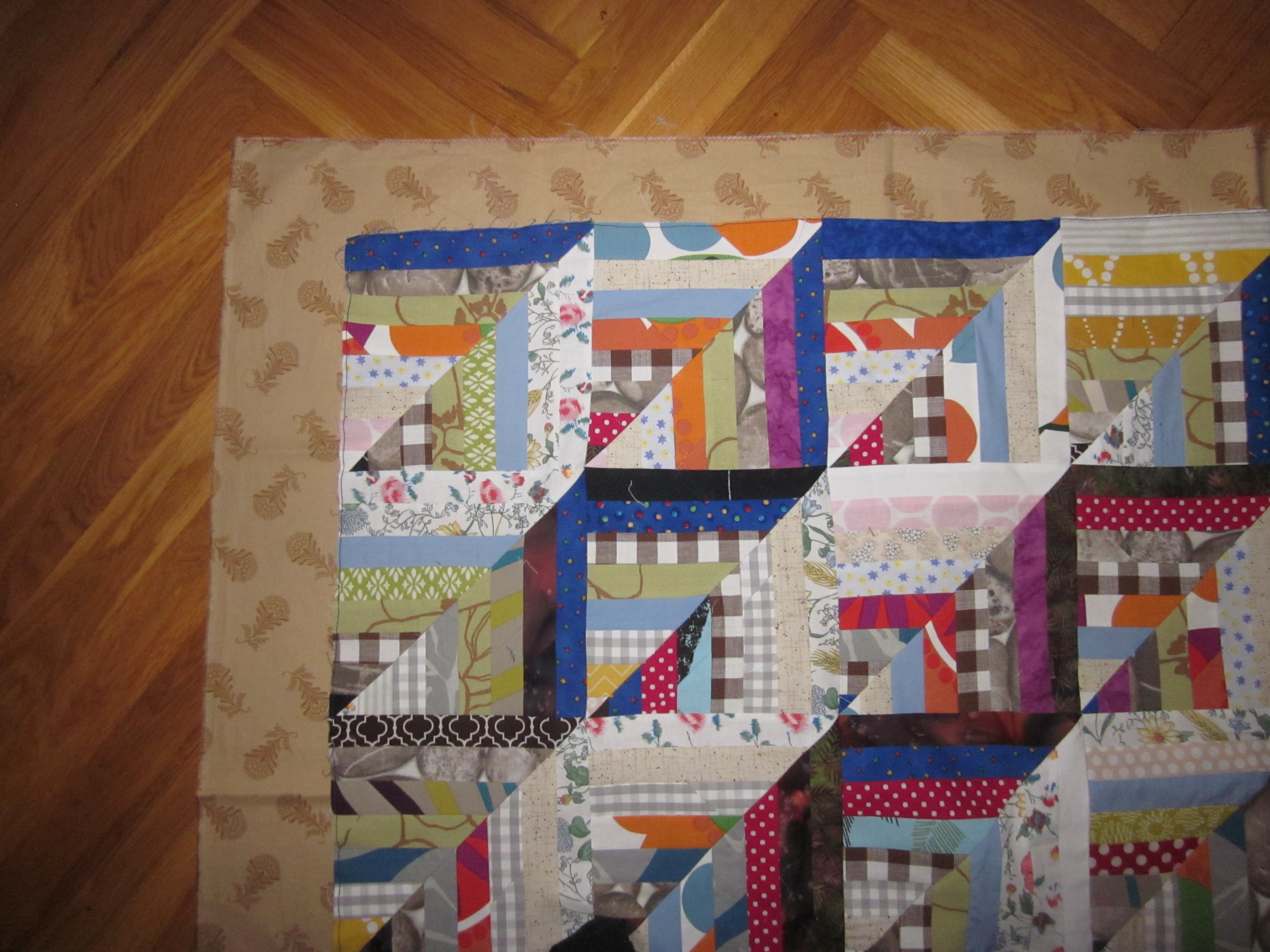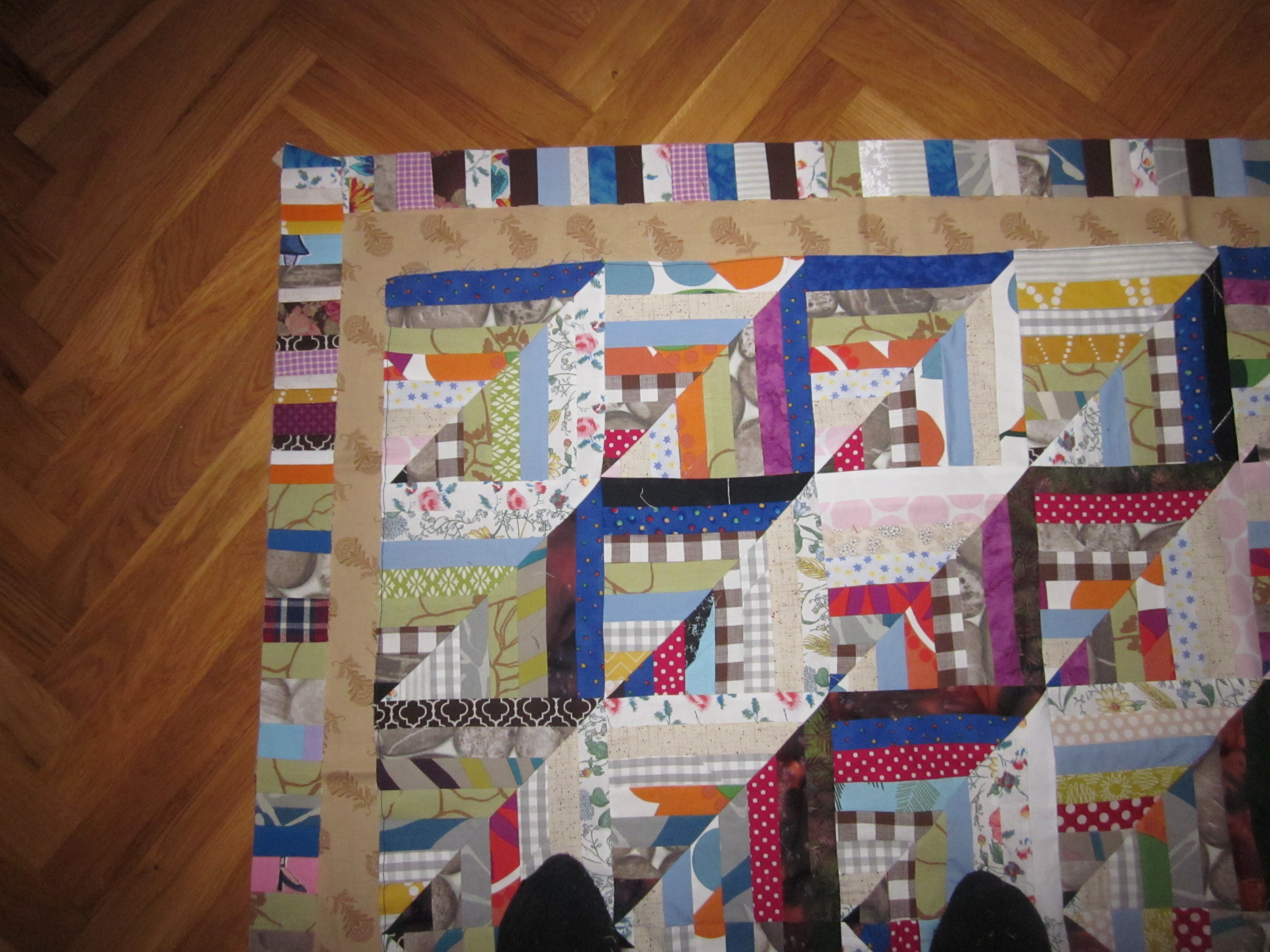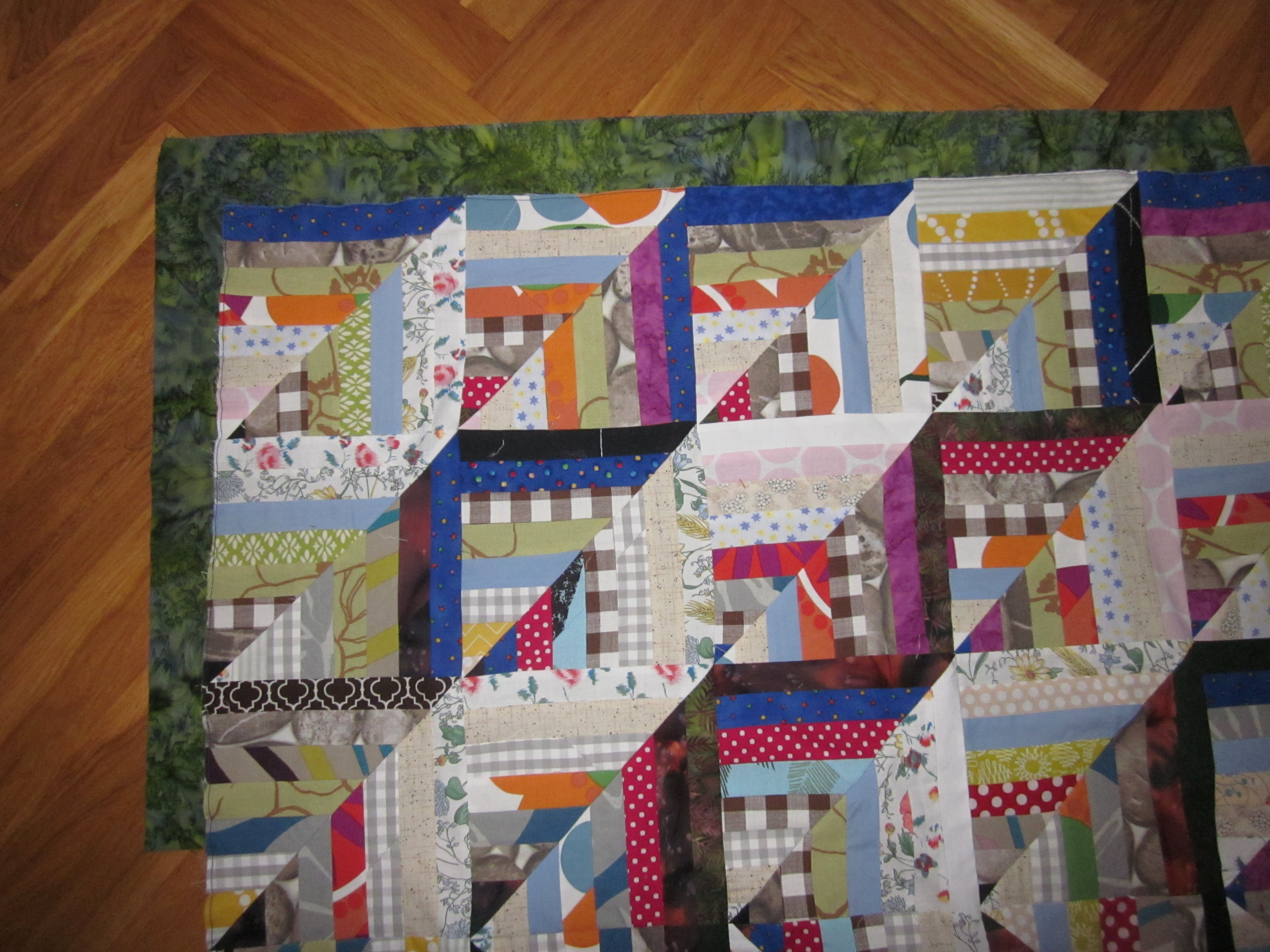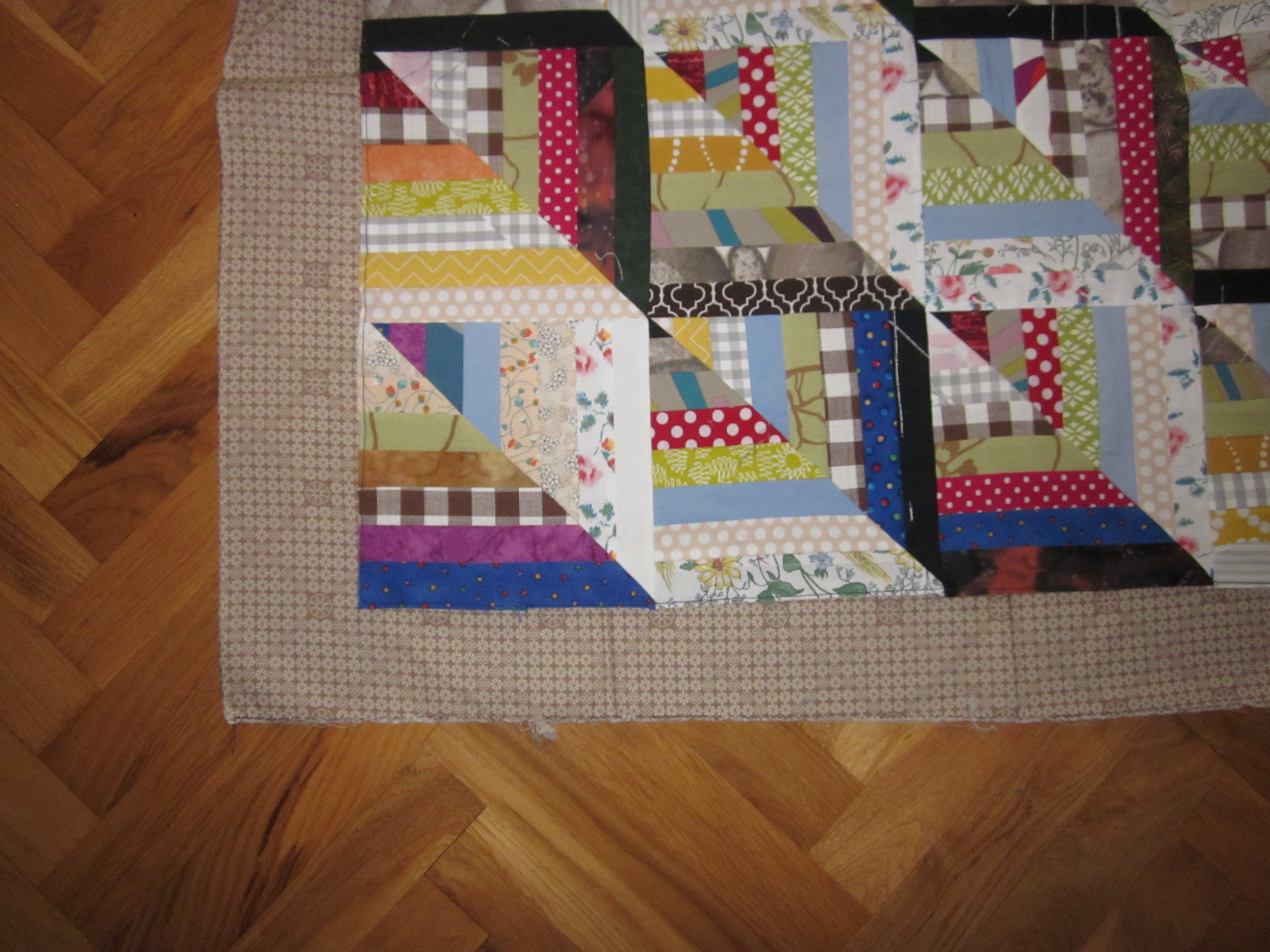 Det är den falska Log Cabin som jag sett hos janegardner.blogspot.se... som jag nu gett mig i kast med. Många remsor är det. Jag har framförallt förbrukat mina "fultyger" och det har faktiskt minskat en hel del. Ett par tre till sådana här quiltar så kanske det tar slut…Det är massor med skarvar i remsorna men det tycker jag inte gör något. Och det blir ju mindre spill då. (Sån man är. Jag längtar till att fultygerna ska ta slut, men jag får absolut inte slösa med dem!!)