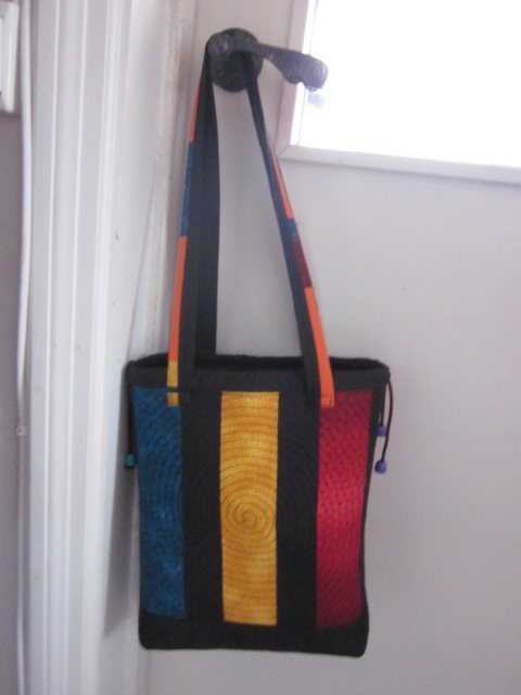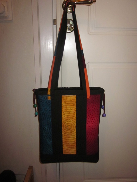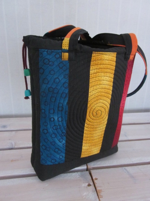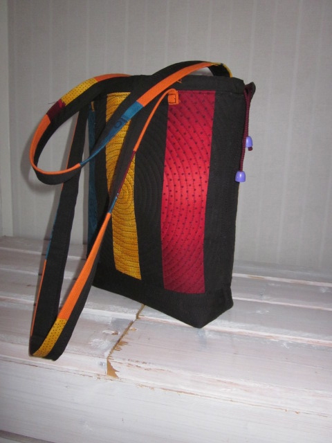 Maria/Majas tyg var så fint så jag hade svårt att sätta kniven i det. Tyckte liksom att så lite som möjligt skulle gå bort i sömsmåner. Men lite rester blev det efter att jag delat remsat i tre bitar, de är inpusslade i handtaget. Sedan testade jag "rondellkörning" vid quiltningen. Avslutade med anoraksnöre i dragskon med ploppar i olika färger. (klicka på bilderna så de blir större.)