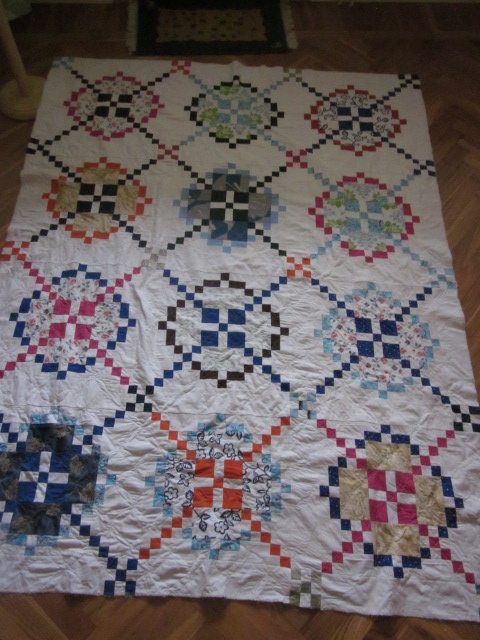 Ja den här quilten blev alltså ett påslakan. Blocken var superkul att sy. Sen slaktade jag ett tunnslitet påslakan och tog som baksida inför quiltningen. Inget mellanlägg. Och det var då det roliga tog slut och jag började svära för mig själv. Och sucka och stöna. Men jag har inte orkat sprätta så mycket som jag borde så det blev VÄLDIGT bubbligt där övertråden drar ihop tyget.