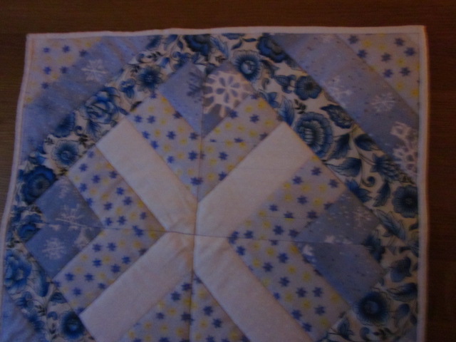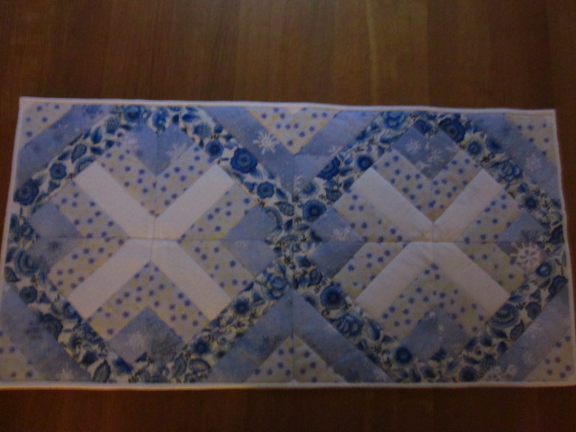 Stärkt av att lyckats lista ut hur Bambi gjort så testade jag en duk till. Den här är jag jättenöjd med. Har kommit fram till att jag är väldigt fascinerad av kedjeeffekter (och 3D). Och eftersom min symaskin fortfarande är på service (fjärde veckan nu) så har jag sytt allt på min gamla maskin. Och tänk, på den går det att quilta. Nu skulle jag vilja quilta något jättefint på den här duken, men jag vet inte vad. Därför ligger den än så länge bara och väntar.
