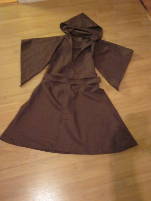 Jag tyckte att femåringen skulle ha en jedi-kåpa, han har ju redan ett "lasersvärd". Idén hittade jag här på nätet någonstans. Jag fick hans mått; från handled till handled med utsträckta armar och längd från axlar och ner. Sen sydde jag på frihand. Tyvärr blev den lite trång över bröstkorgen. Men där har jag lagt in små kilar nu så förhoppningsvis passar den bättre nu.