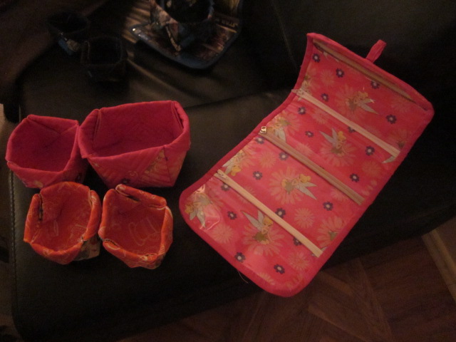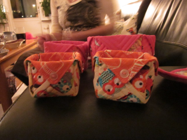 Och sen har jag sytt små burkar, massvis. Såna som "alla" syr nu. Fyra-fem vardera till fyra barnbarn. Här är ett par uppsättningar. Och i senaste numret av Fat Quarter bjöd Mossby Quiltshop på ett möster på förvaring för småsaker. En var fick barnen. Storlekarna fick jag anpassa till de rester av syplast jag hade liggande.