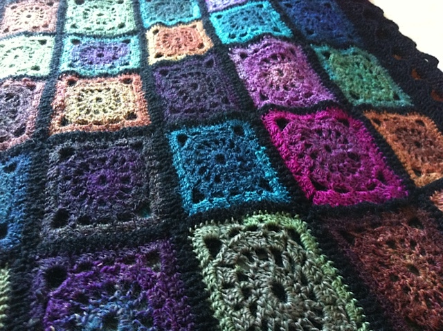 Tina har också skickat foto på filten av mormorsrutor som jag virkade till henne för nåt år sedan. Den är ju riktigt fin ju. HÄrliga färger.