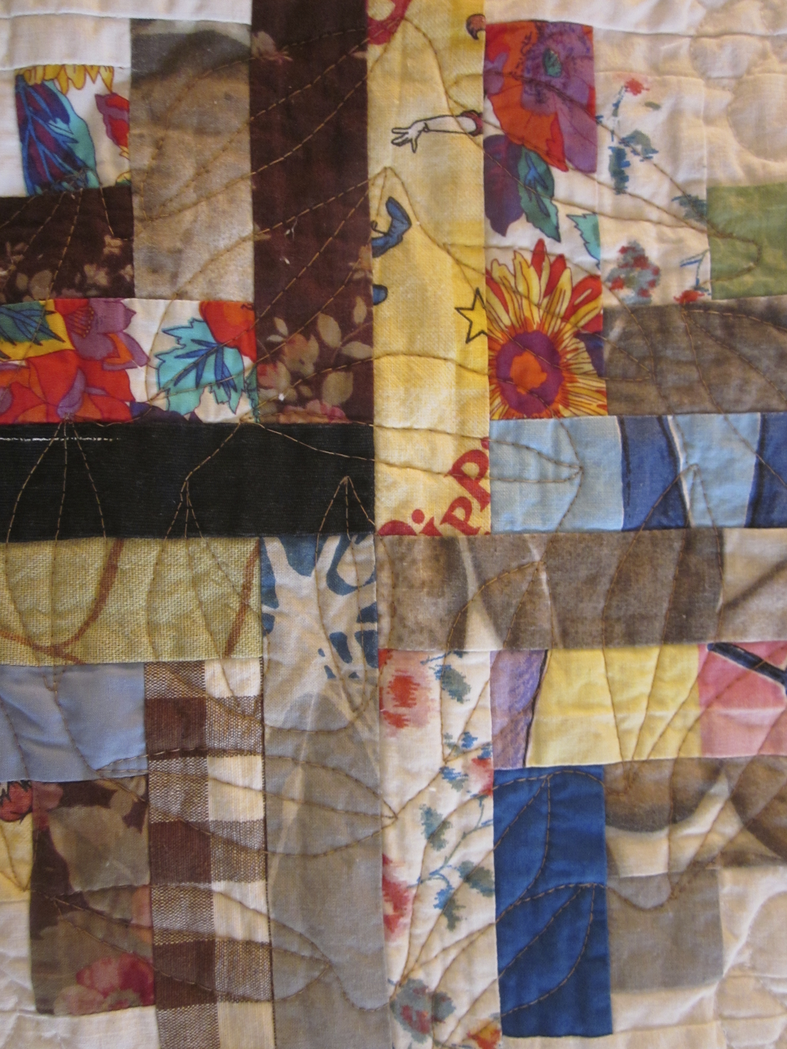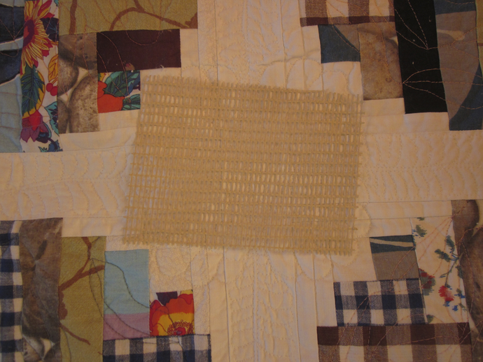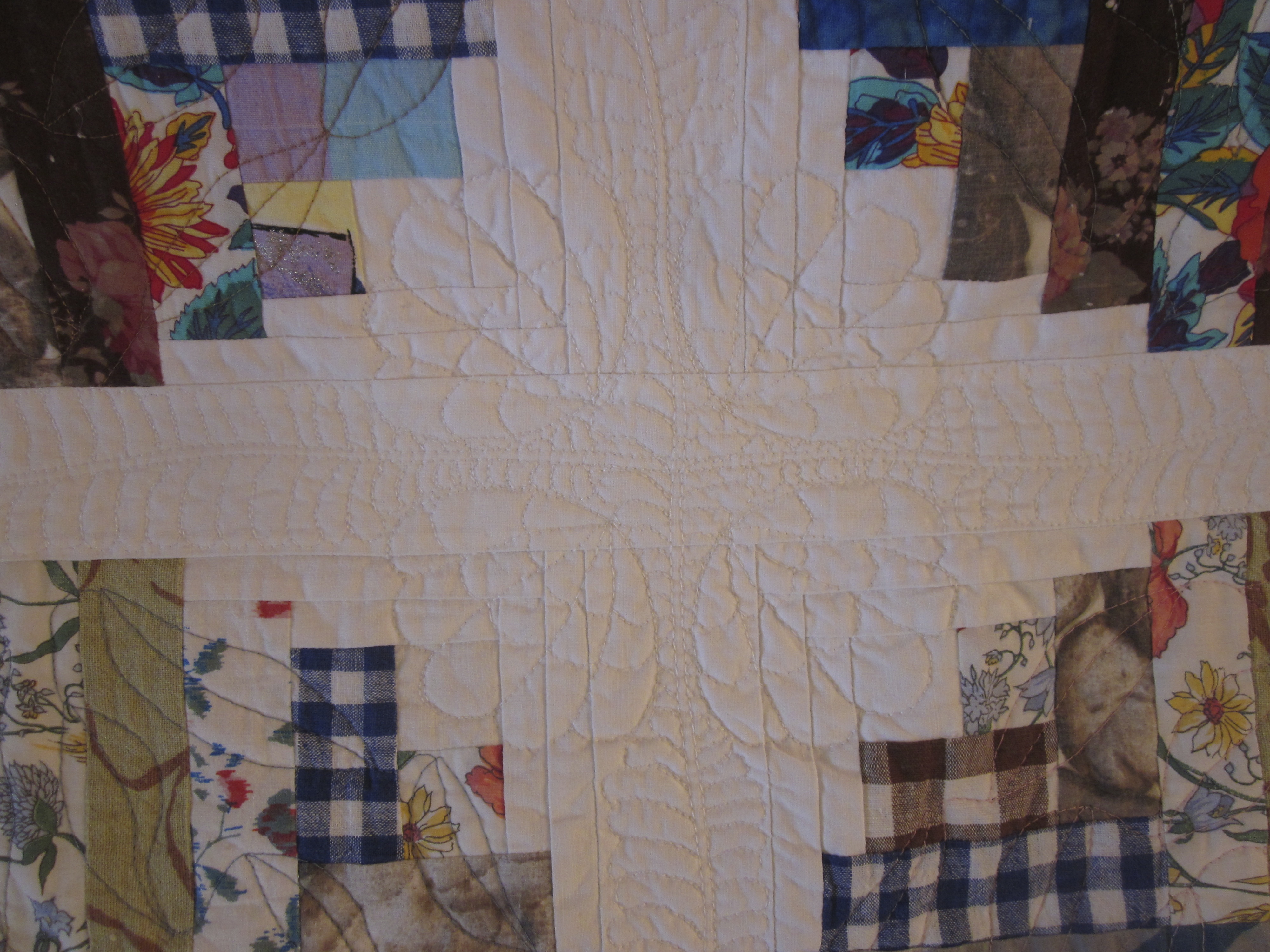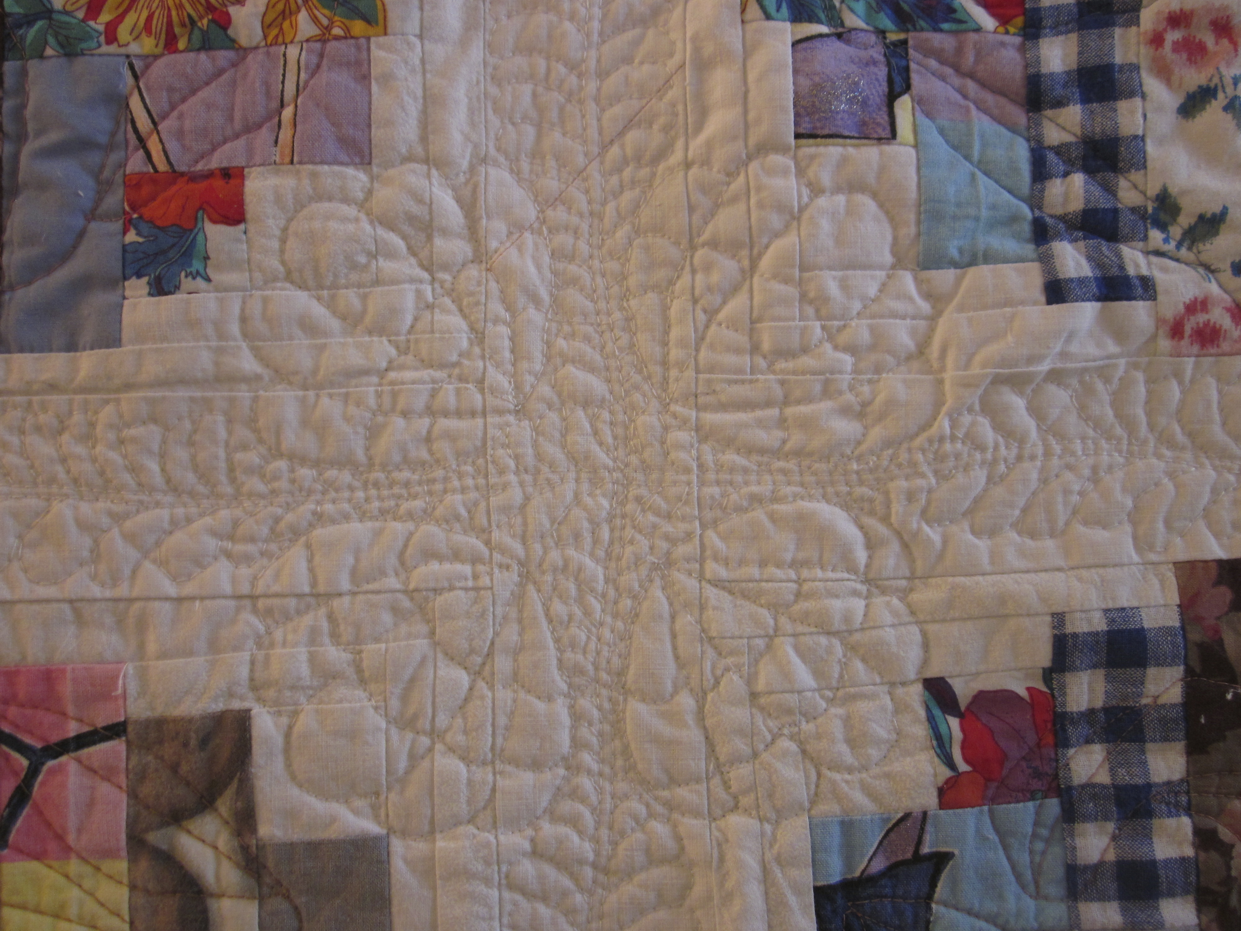 Det vita är tätt quiltat med någon slags "blomma" i mitten och så min variant av fjädrar däremellan. Själva blomman ritade jag upp med sån där penna som man tar bort med vatten, resten är helt på frihand. Det tog en enorm tid att quilta men jag är faktiskt hyfsat nöjd med resultatet. Visst, det syns fortfarande att jag är nybörjare. Ska träna mera på fjädrar, det går att få dem mycket finare det har jag sett massvis med exempel på.