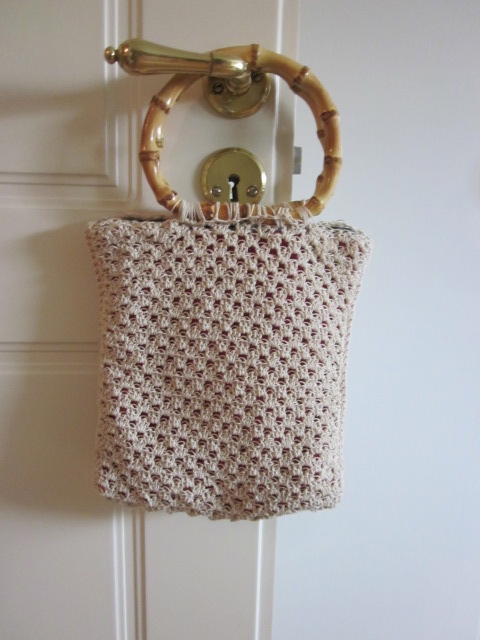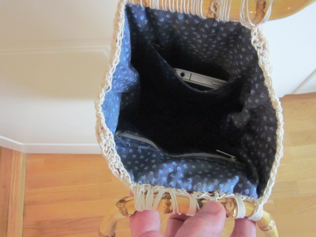 Men jag tar saker och ting i lite tidsföljd. Under de sista dagarna på min första semesterperiod virkade jag en pytteväska till Tina. Hon hade en förlaga i svart och ville ha en ljus också. Jag hade restgarn låg, från en rund matta som jag virkade nån gång i början på 80-talet, den är sedan länge utsliten och kastad, men restgarnet fanns kvar. Jag virkade i grupper om tre stolpar så det blev lite hålmönster. Därför är den fodrad med dubbla tyger, först ett rosa med rätsidan utåt så det lyser igenom lite grann och sedan ett mer neutralt med rätsidan inåt. Sydde också dit ett telefonfack och en ficka med dragkedja.