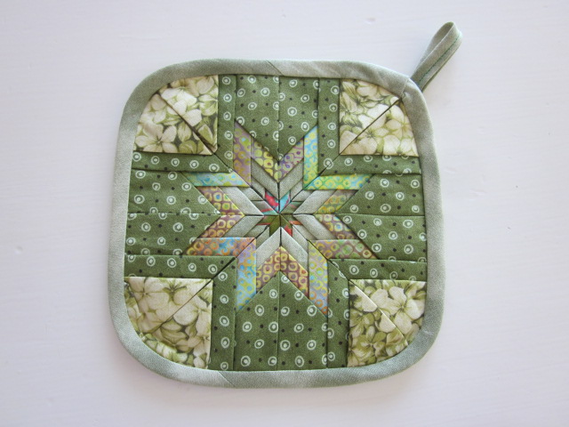 Först gjorde jag grytlappen. Det är extremt få sömmar så jag höll väldigt korta avstånd mellan tygerna. Men slutresultatet blev inte bra,