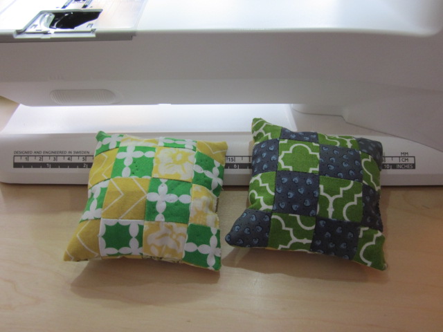Efter denna duk gjorde jag återigen helt slut på alla mina scraps. De räckte till två minismå nåldynor. En till mig och en till väskmottagaren. Jag upptäckte att de inte har någon nåldyna till sina tre synålar och en stoppnål. Det måste de naturligtvis ha! :)