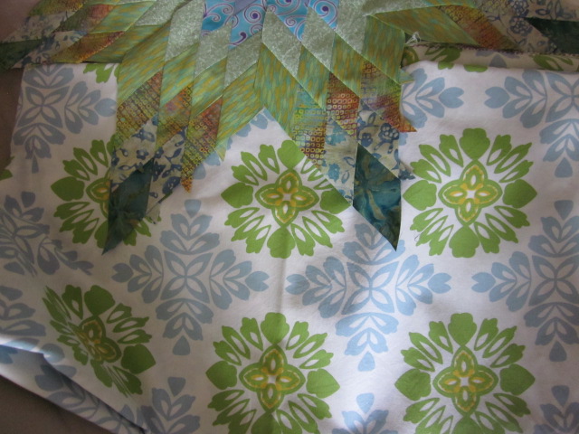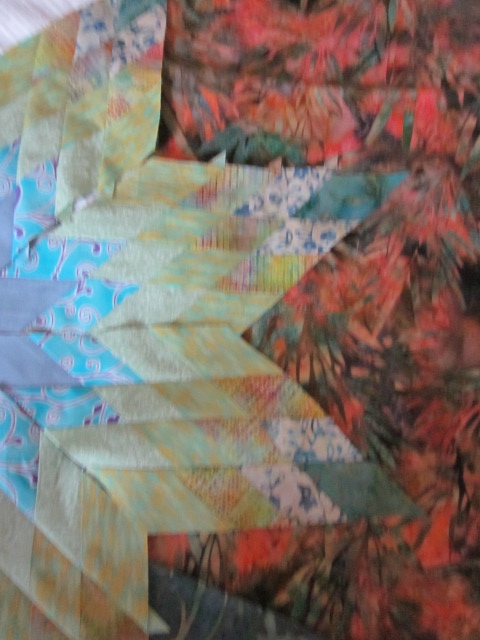 Fotona visar ALLA tyger jag har som skulle räcka till som bakgrundstyg. Jag hade nog tänkt mig ett mer neutralt tyg. Beige, ljusgult och småmönstrat. I går beställde jag tyg till baksidan av min Labyrintquilt, från Stoff o Stil. Borde ju planerat lite grann och kollat om de hade något passande tyg som jag kunnat få med för samma portokostnad. Planering, framförhållning och att tänka sig för är visst inte riktigt min grej just nu.