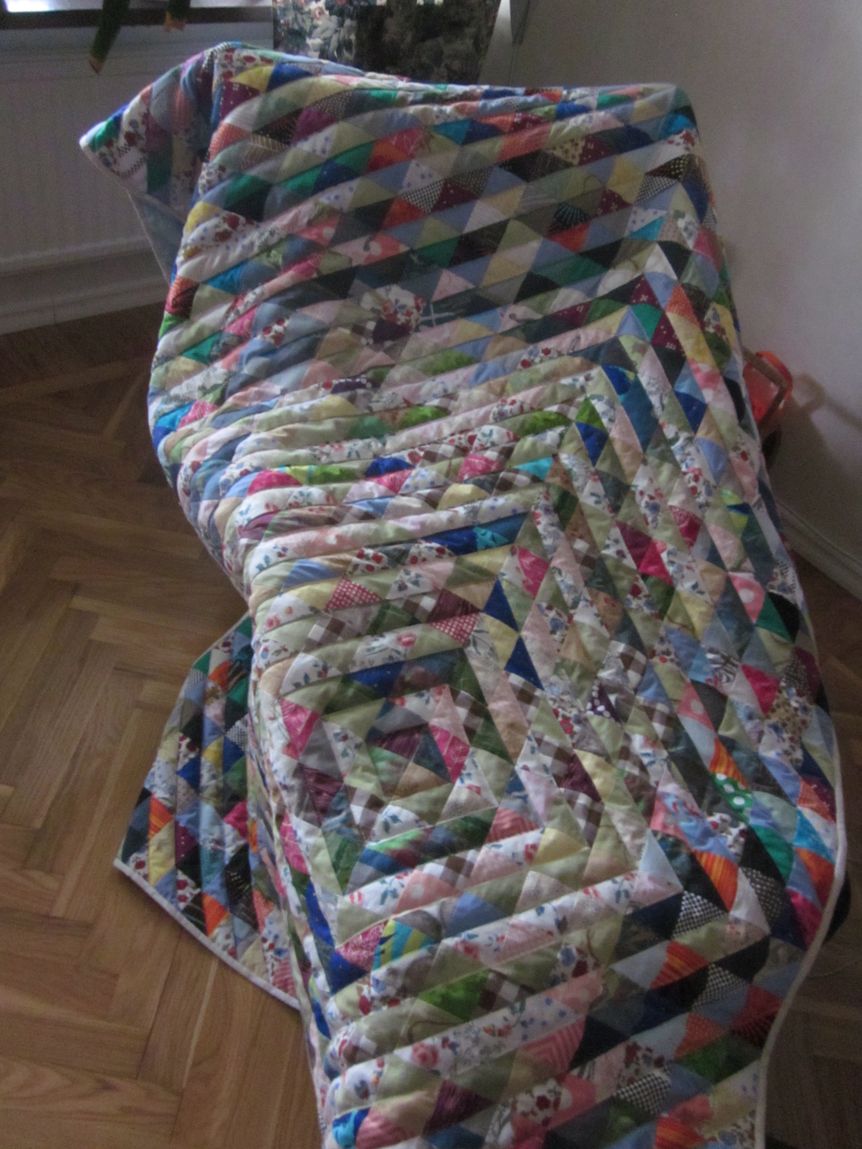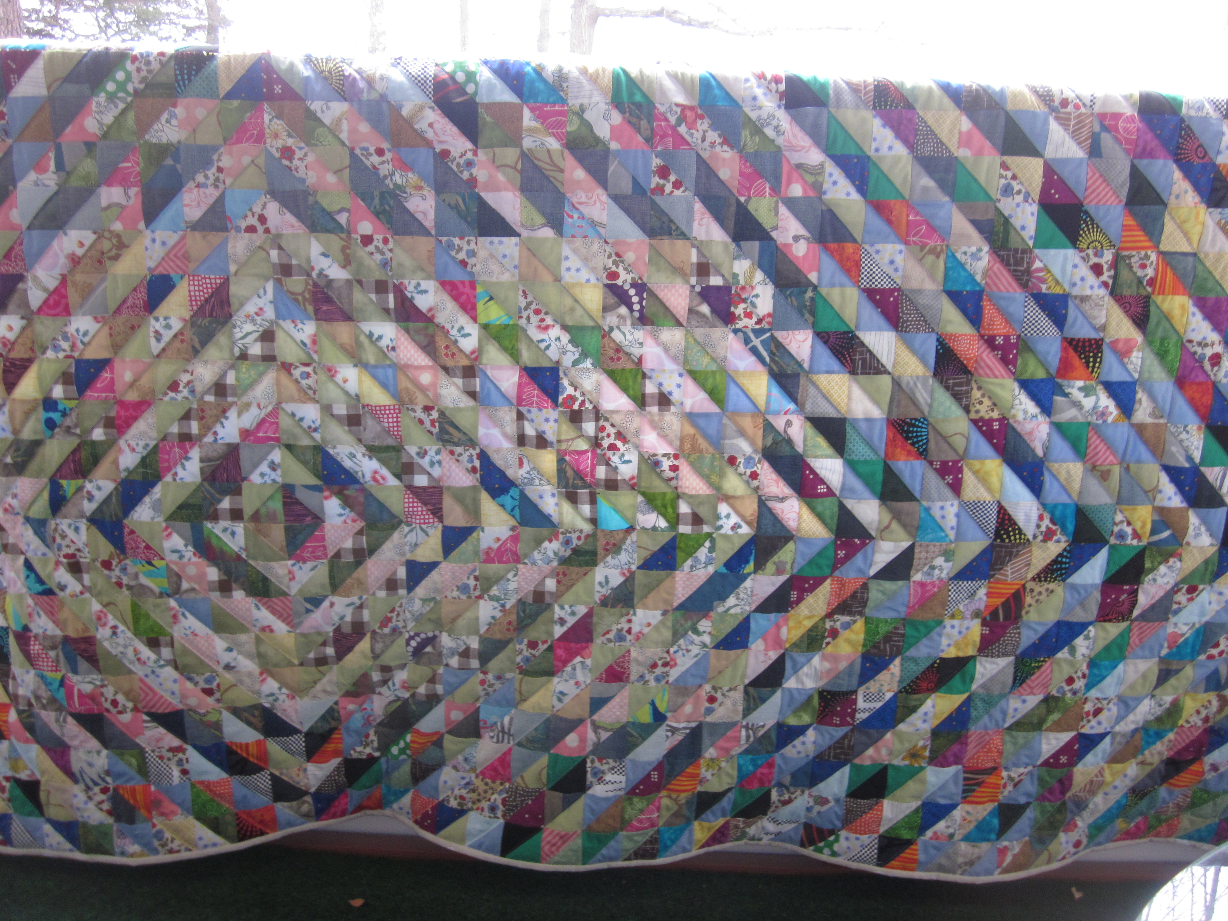 Nu är jag färdig med mitt scraptäcke. Jag är riktigt nöjd med det. Jag började ju fel, sydde ihop det jag hade till en liten miniquilt och tänkte att jag skulle bygga vidare vartefter scrapsen "förökade" sig. Men det gjorde att man i mitten kan se en "egen" färgruta. Där hade jag väldigt mycket gröna scraps. Så därefter lade jag mina fyrkanter på hög vartefter jag sytt ihop dem. När jag sedan hade tillräckligt många såg jag verkligen till att de blandades ordentligt. Quilten är ca 2,20 x 1,40 m, ett bra mått tycker jag. Den består av 40x26 st fyrkanter = 1040 stycken. Alltså 2080 trekanter.