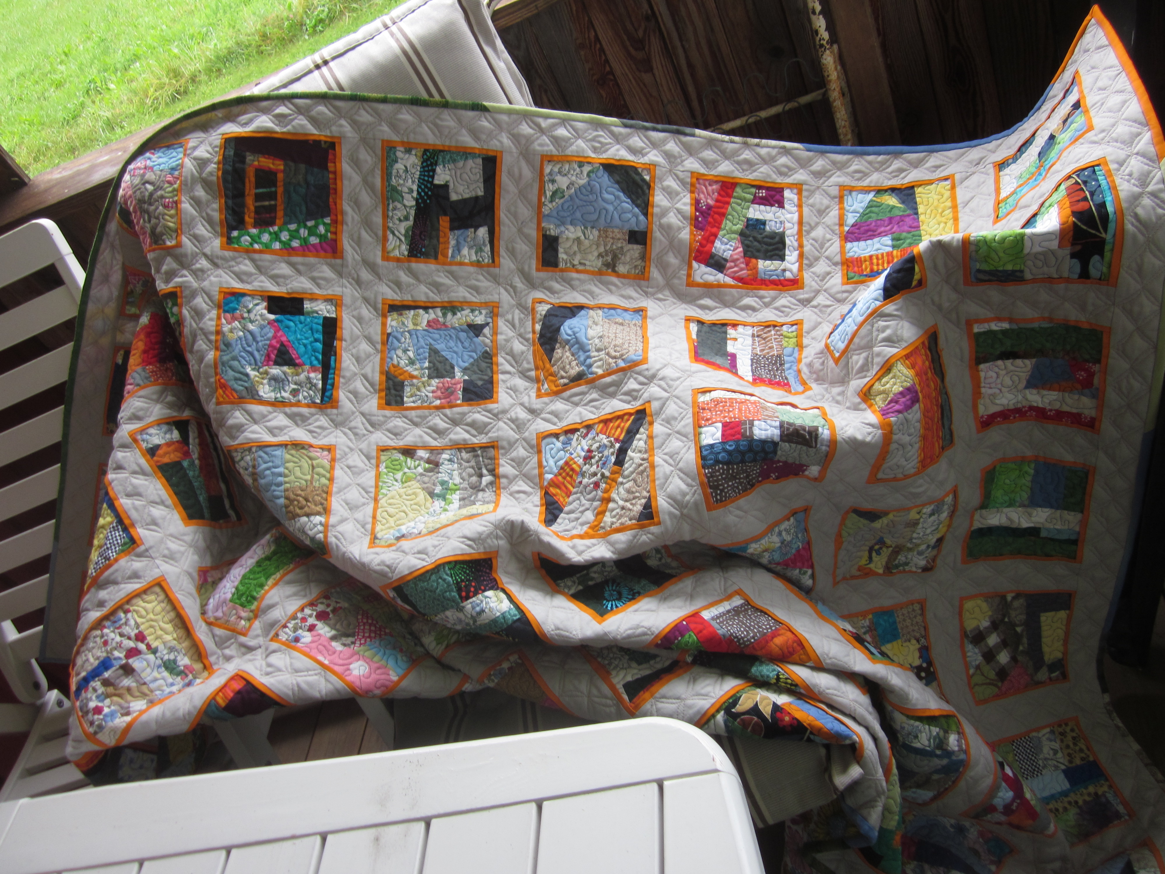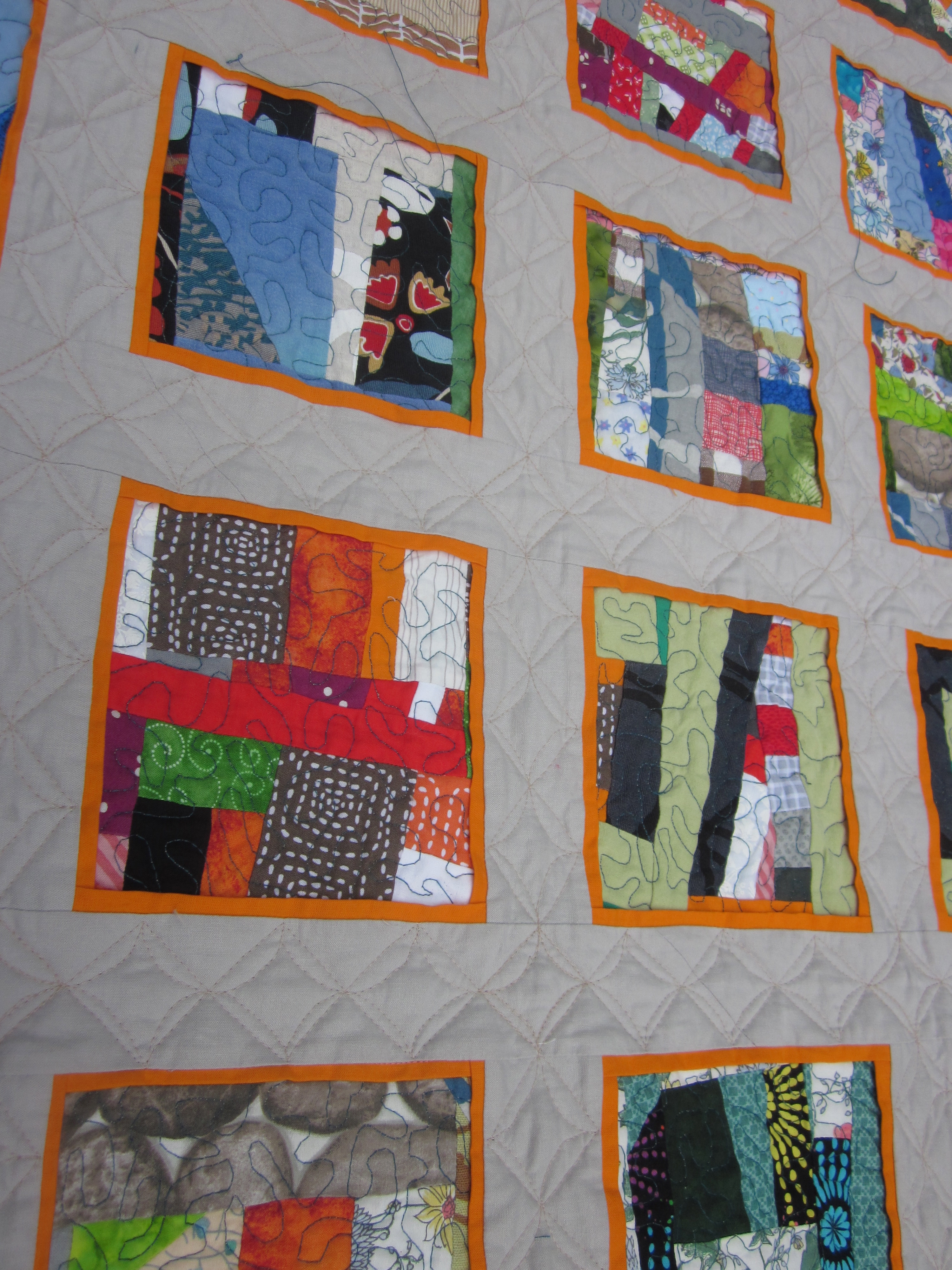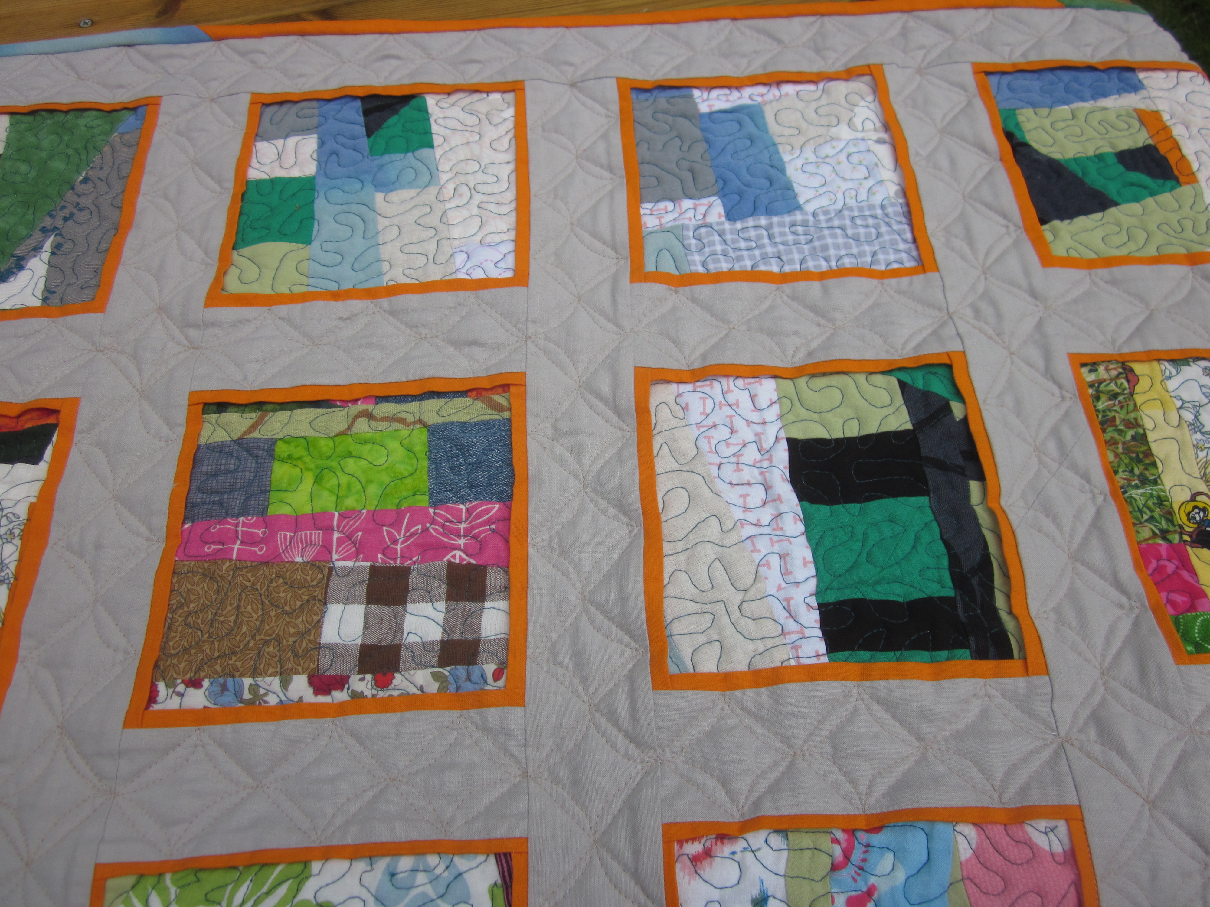 Till den här lyckades jag verkligen göra slut på riktiga småsmulor. Jag har tagit reda på varenda liten tygbit jag hade, har blandat färger hej vilt. Har försökt hålla ihop det hela med grått emellan och en orange tittkant på varje ruta.Men jag fick ett litet problem med det gråa mellan rutorna, hade köpt för lite. Men jag lyckades hitta ett tyg som stämde väldigt bra i färg så nu vet jag inte längre var den lilla malören hamnade.Visserligen var det nya tyget lite stretchigt, men det handlar bara om 30-40 cm så det är inget som märks.