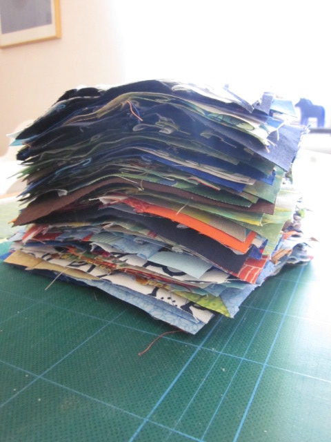 Men väl hemkommen så började jag titta lite grann på mina Tula Pink-block. Jag sorterade ut dem på golvet och försökte få till olika "färggrupper". Den första jag såg som använt sig av den lösningen var Ingela, pysseltorpet.blogspot.se. Sen har jag sett flera och det verkar vara en lösning som tilltalar mig, så jag försökte mig på det. Men oj oj oj, vad många röriga färger jag har. Efter mycket om och men bestämde jag mig till slut och här ligger nu högen med 90 av blocken, ordentligt numrerade så jag inte ska ta fel eller vända en rad upp och ner.
