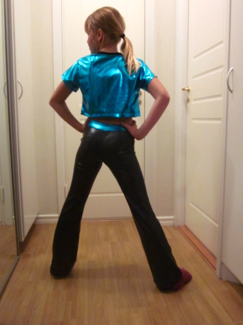 Här är Leia i den superglittriga utstyrseln hon ska ha vid sin singeldans. Mycket svårt tyg att sy i. Och det blev hål kvar efter knappnålarna så jag kunde bara nåla i sömsmånen. Men läckert blev det!